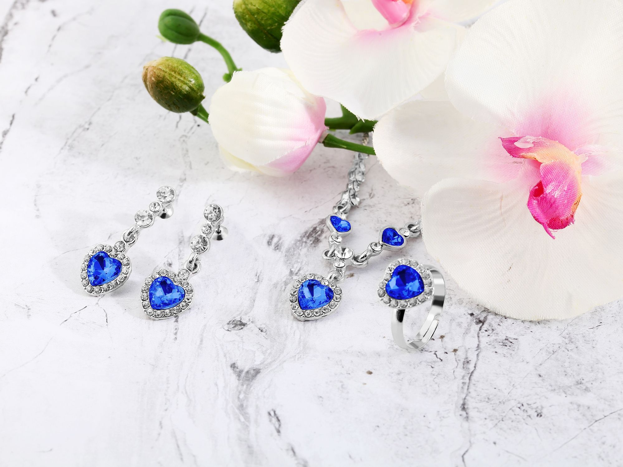 Das Geschenkset der Marke Excellanc besteht aus einer Damenarmbanduhr, einer Halskette, einem Paar Ohrsteckern und einem Fingerring. Alle Schmuckstücke sind silberfarben und mit blauen und weißen Schmucksteinen verziert. Das Zifferblatt der Uhr ist ebenfalls silberfarben. Das Muster eines Herzens findet sich im Kettenanhänger, in den Ohrsteckern und im Fingerring wieder und komplettiert die stimmige Kombination aller Schmuckstücke, die in einer praktischen Klappbox geliefert werden. Der Anhänger der Kette, die Ohrstecker und der Ringkopf bestehen aus einem großen Similistein in Herzform, der mit jeweils 16 kleinen Schmucksteinen umrandet ist. Außerdem hat der Ring eine offene Ringschiene, sodass er in der Größe verändert werden kann. Die Länge der Halskette im Panzermuster beträgt 58 cm inklusive einer 6 cm langen Verlängerungskette. Dies ermöglicht es in der Länge zu variieren und die moderne Schmuckkette so jedem Outfit anpassen zu können. Die Armbanduhr ist eine klassische 3-Zeiger Uhr mit einem hochwertigen Quarzuhrwerk. Sie hat eine Länge von 22 cm, einen Gehäusedurchmesser von 36 mm und eine Gehäusehöhe von 9 mm. Die Lünette ist mit 56 Similisteinen verziert und passt sich gut dem glitzernden Schmuckset an. Die Geschenkbox hat eine Abmessung von 14,8 cm in der Länge, 21,5 cm in der Breite und 5,8 cm in der Höhe.
