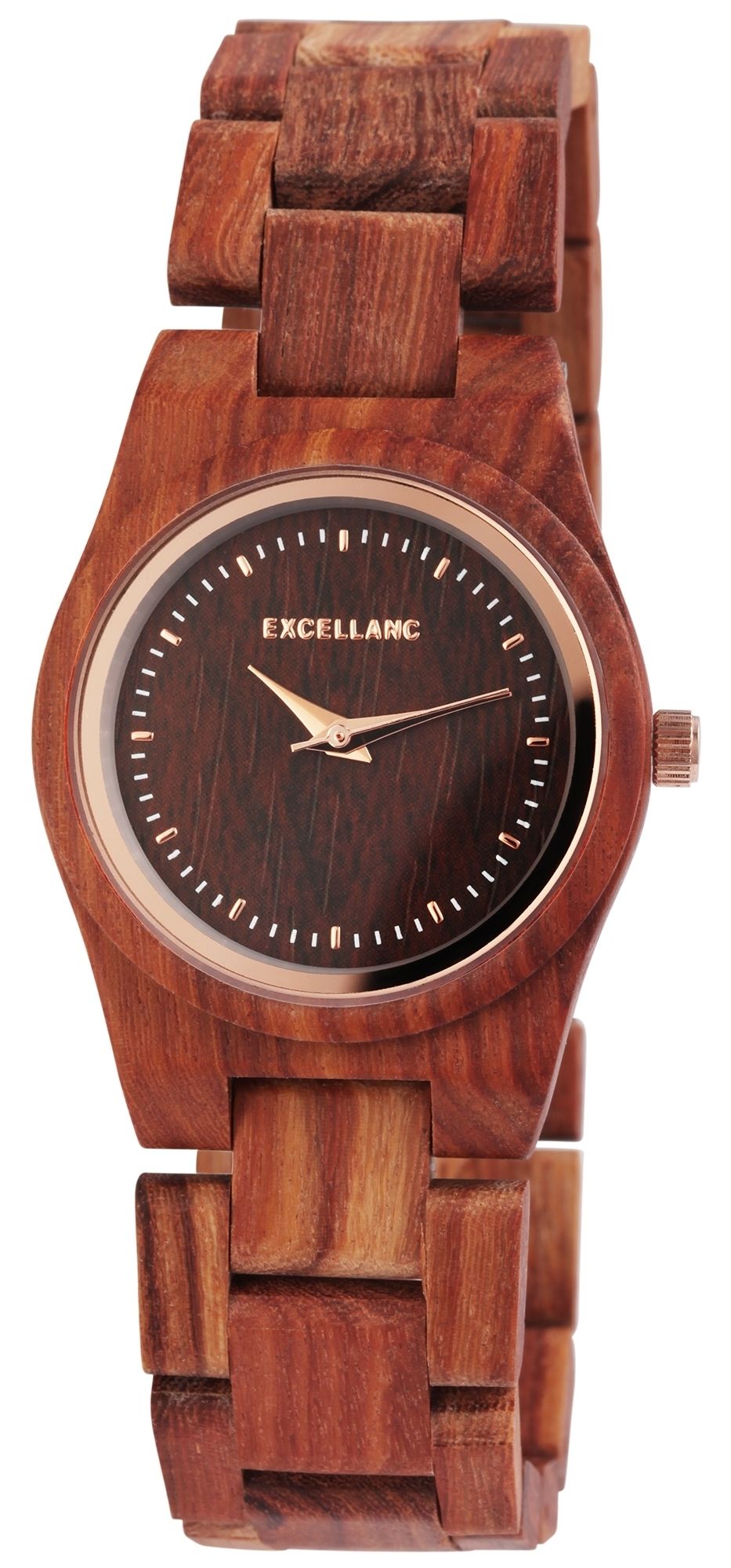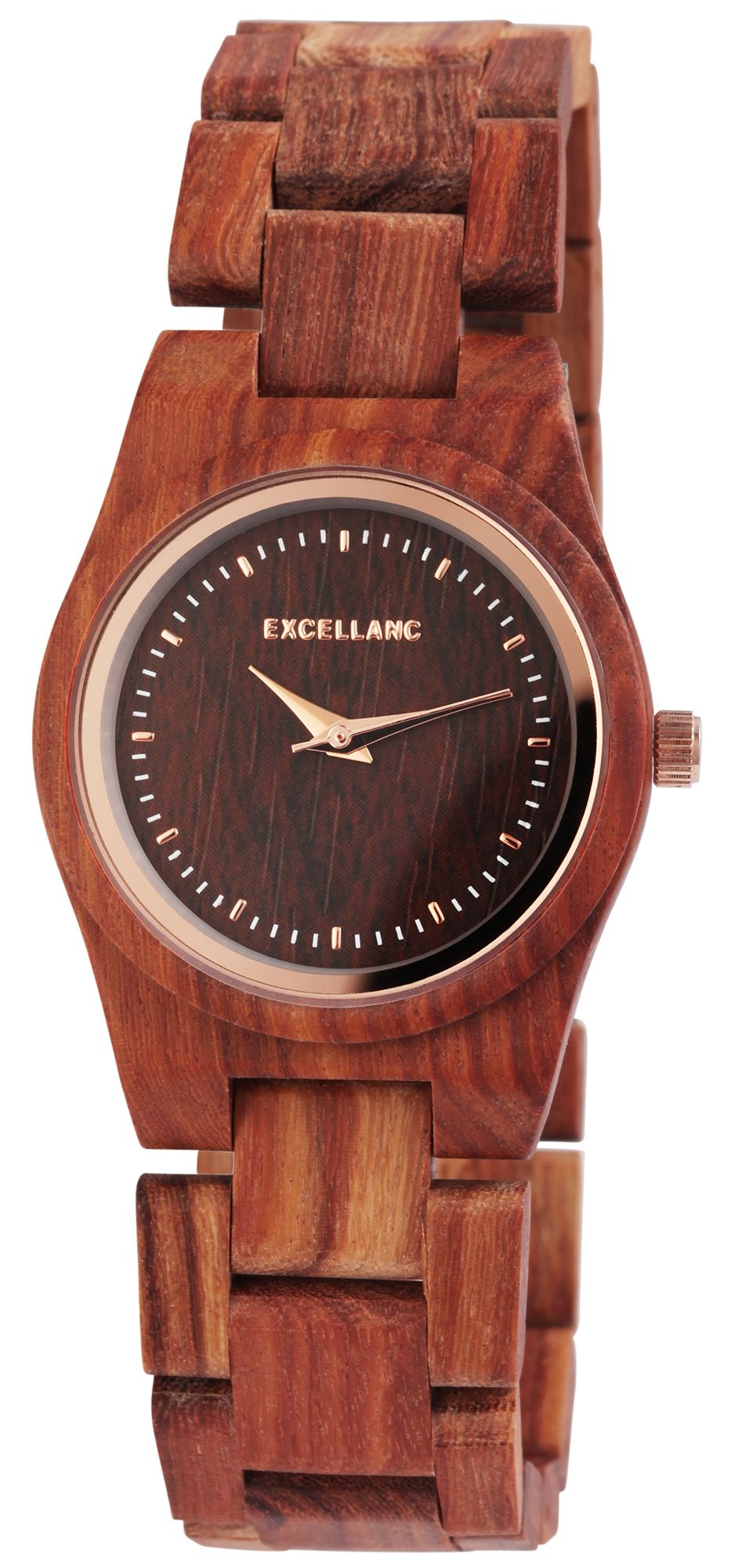 Die analoge 3-Zeiger Damenarmbanduhr der Marke Excellanc verfügt über ein hochwertiges Quarzuhrwerk. Das Gliederarmband aus Sandelholz ist am Anstoß 20 mm breit und lässt sich über eine silberfarbene Edelstahlfaltschließe öffnen und schließen. Die Gesamtlänge der Uhr beträgt 21 cm. Das Holzgehäuse mit Mineralglas hat eine Abmessung von 32 mm im Durchmesser und einer Gehäusehöhe von 10 mm. Ein besonderer Hingucker ist das Mineralglas, welches einen 1 mm breiten roségoldfarbenen Spiegelrand hat. Zusammen mit der dazu farblich abgestimmten Krone rundet dieser den einzigartigen Look der Uhr ab. Das Zifferblatt ist ebenfalls aus Sandelholz gefertigt und zeigt sich in denselben Farben, wie auch das Band und das Gehäuse. Die roségoldfarbenen Zeiger passen sich optisch gut dem Gesamtbild der Uhr an und runden dies harmonisch ab. Mit diesem Uhrenmodell tragen Sie einen absoluten Hingucker am Handgelenk, den man zu jedem Anlass kombinieren kann. Durch das leichte Material passt sie sich perfekt dem Handgelenk an und ist angenehm zu tragen. Die Uhr eignet sich perfekt als Geschenk. Zum Beispiel zum Geburtstag, zum Muttertag, zu Weihnachten und zum Valentinstag.