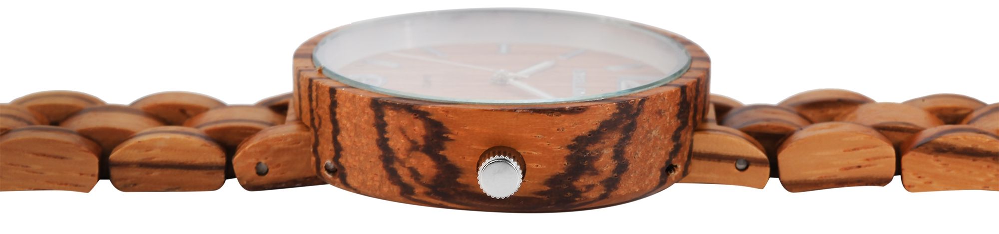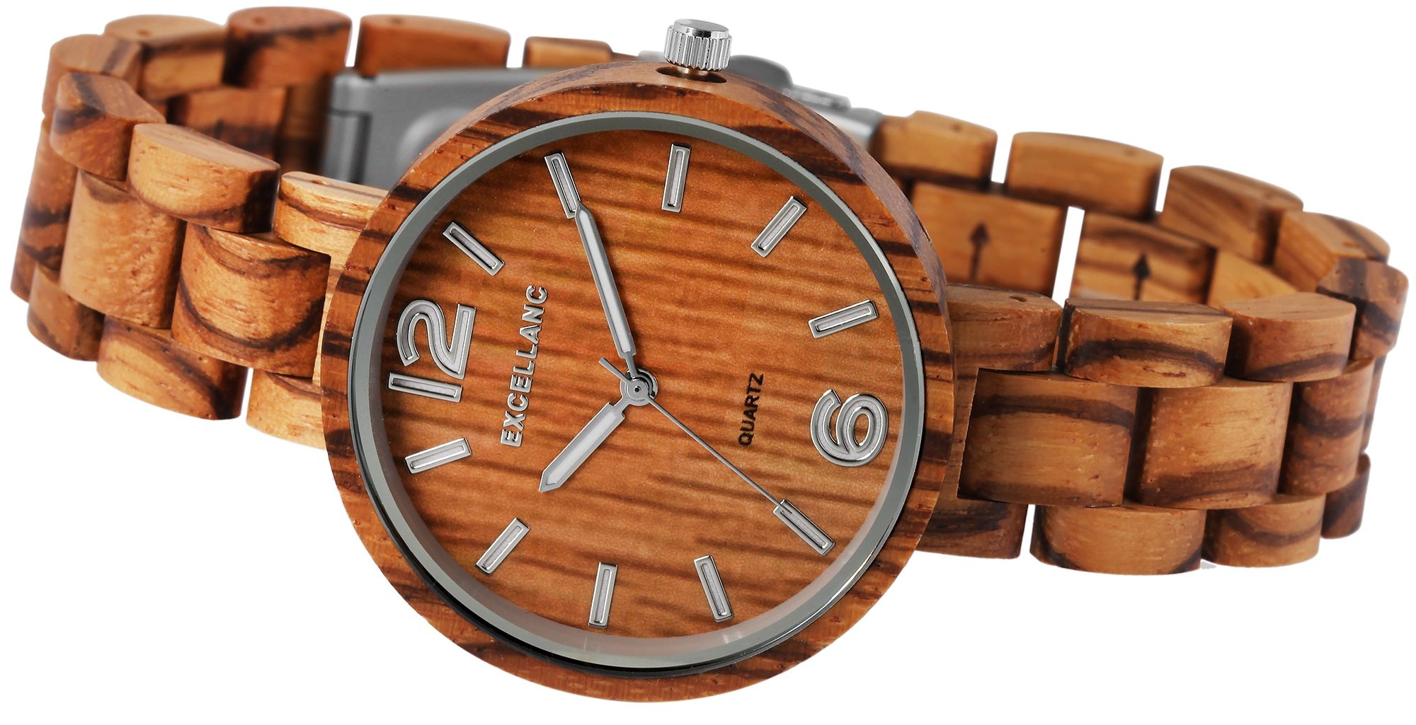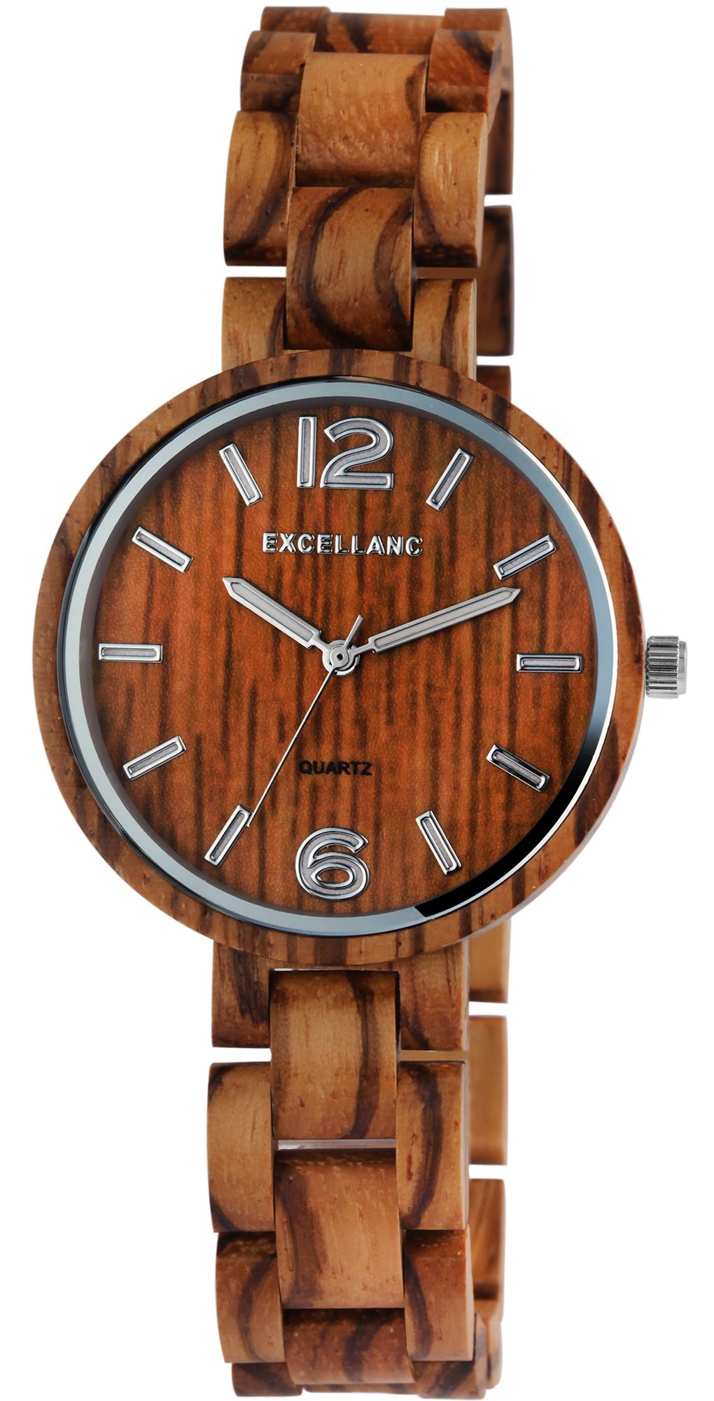 Die analoge 3-Zeiger Damenarmbanduhr der Marke Excellanc verfügt über ein hochwertiges Quarzuhrwerk. Das Armband aus Zebraholz ist am Anstoß 16 mm breit und lässt sich mit einer silberfarbenen Edelstahlfaltschließe öffnen und schließen. Die Gesamtlänge der Uhr beträgt 22 cm, lässt sich aber aufgrund der herausnehmen Elemente beliebig kürzen. Das ebenfalls aus Zebraholz gefertigte Gehäuse mit gleichfarbigem Holzgehäuseboden und Mineralglas hat eine Abmessung von 38 mm im Durchmesser und einer Gehäusehöhe von 11 mm. Ein optisches Highlight ist das Mineralglas, welches am äußeren Rand einen silberfarbenen Spiegelrand hat. Dieser verleiht der Uhr zusammen mit der farblich abgestimmten Krone einen edlen Look. Das Zifferblatt ist ebenfalls aus Holz gefertigt. Die Zeiger und die Strichindexe passen sich farblich an und runden das Gesamtbild harmonisch ab. Eine weitere Besonderheit sind die mit Superluminova beschichteten Zeiger und Indexe, die das Ablesen der Uhrzeit auch im Dunkeln ermöglichen. Jede Holzuhr ist in seiner Beschaffenheit einzigartig und individuell. Sie ist ein Statement zum nachhaltigen denken und gleichzeitig ein modisches Accessoire. Die Leichtigkeit des natürlichen Rohstoffes sorgt für einen angenehmen Tragekomfort, sodass sich dieses zeitlose Uhrenmodell nicht mehr wegdenken lässt.