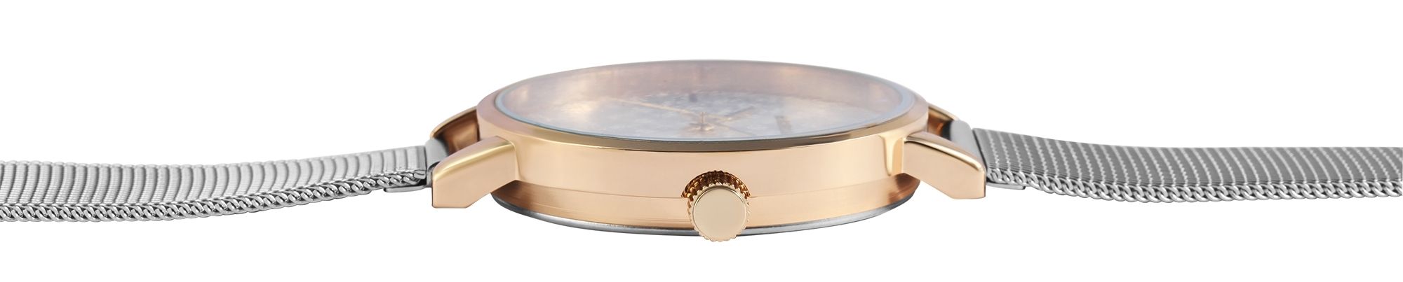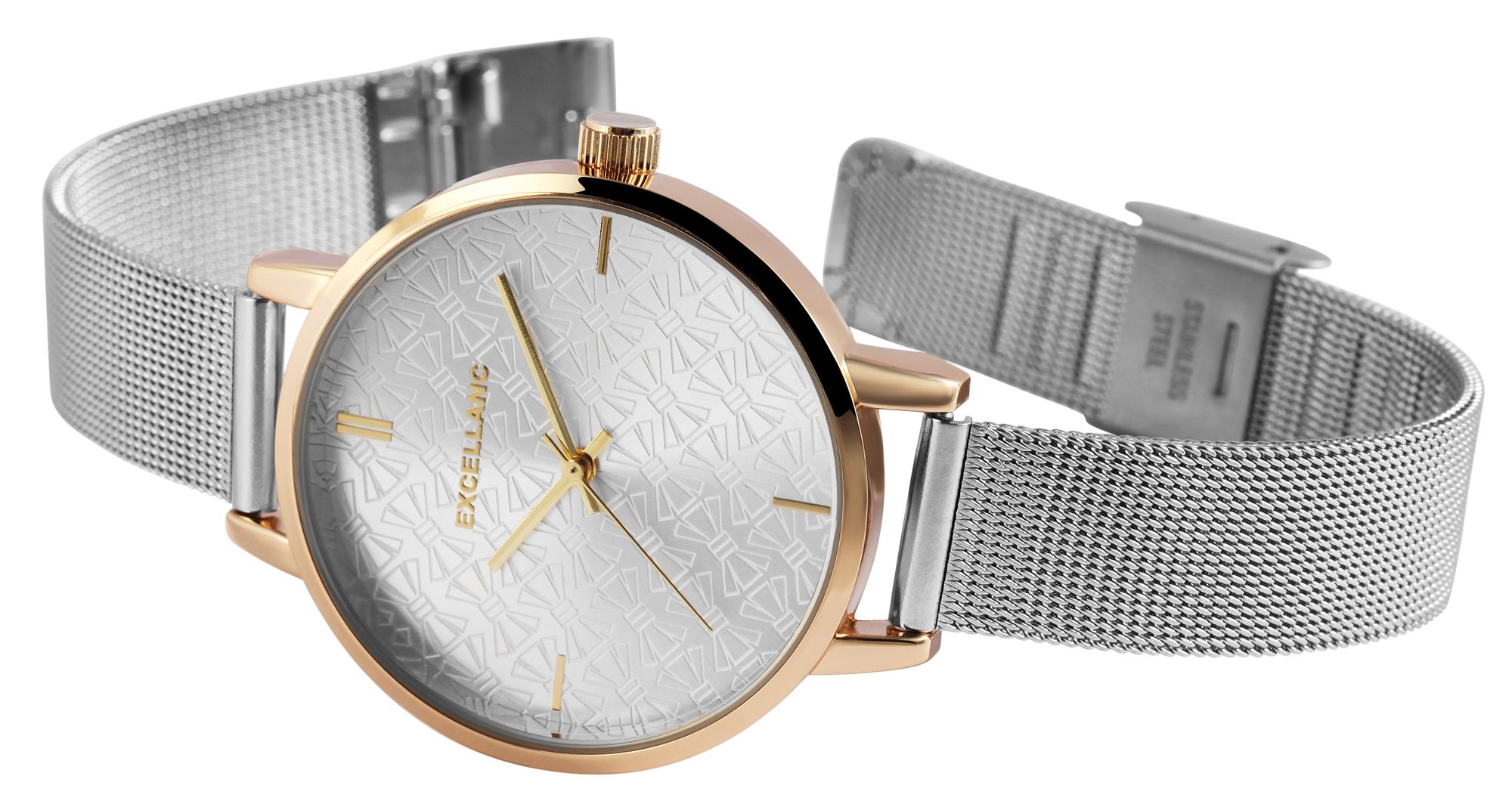Die analoge 3-Zeiger Damenuhr der Marke Excellanc verfügt über das hochwertige Quarzuhrwerk PC21. Das silberfarbene Edelstahl Meshband ist 14 mm breit. Öffnen und schließen lässt sie sich mit Hilfe eines einfach einzustellenden Edelstahl Hakenverschluss und die Gesamtlänge der Uhr beträgt 23 cm. Das goldfarbene Metallgehäuse mit Mineralglas hat einen Durchmesser von 38 mm und eine Gehäusehöhe von 9 mm. Der silberfarbene Gehäuseboden ist aus Edelstahl gefertigt. Auf dem silberfarbenen Zifferblatt gibt es eine Strichindex Einteilung auf "3", "6", "9" und "12" Uhr und die goldfarbenen Zeiger haben die gleiche Farbe wie die Indexe. Highlight ist das verzierte Zifferblatt auf dem viele, kleine Schleifen zu sehen sind. Diese im Design zeitlose Uhr eignet sich als Geschenk beispielsweise zu Weihnachten, zum Valentinstag, Muttertag oder Geburtstag.