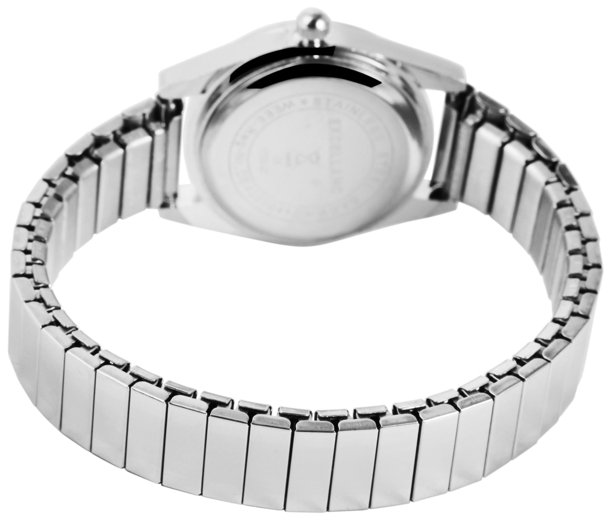 Die analoge 3-Zeiger Damenarmbanduhr der Marke Excellanc verfügt über ein hochwertiges Quarzuhrwerk. Das Edelstahlzugarmband ist am Anstoß 14 mm breit und lässt sich aufgrund des flexiblen Armbandes besonders bequem und einfach über das Handgelenk ziehen. Die Gesamtlänge der Uhr beträgt 20 cm. Das Metallgehäuse mit Mineralglas hat eine Abmessung von 28 mm im Durchmesser und einer Gehäusehöhe von 8 mm. Der Gehäuseboden ist aus Edelstahl gefertigt. Dank des schlichten Zifferblattes und der übersichtlichen Einteilung lässt sich die Uhrzeit schnell auf einen Blick ablesen.