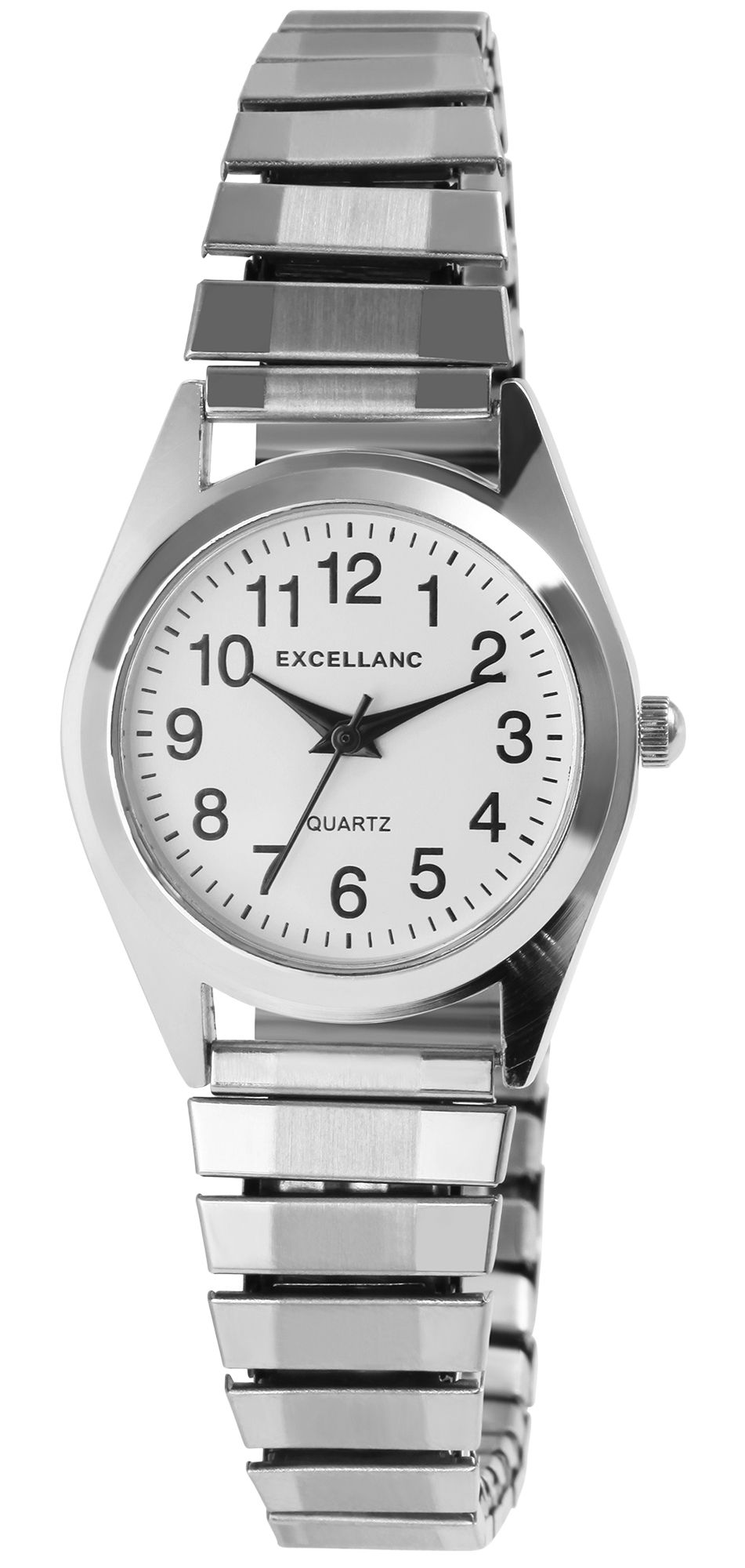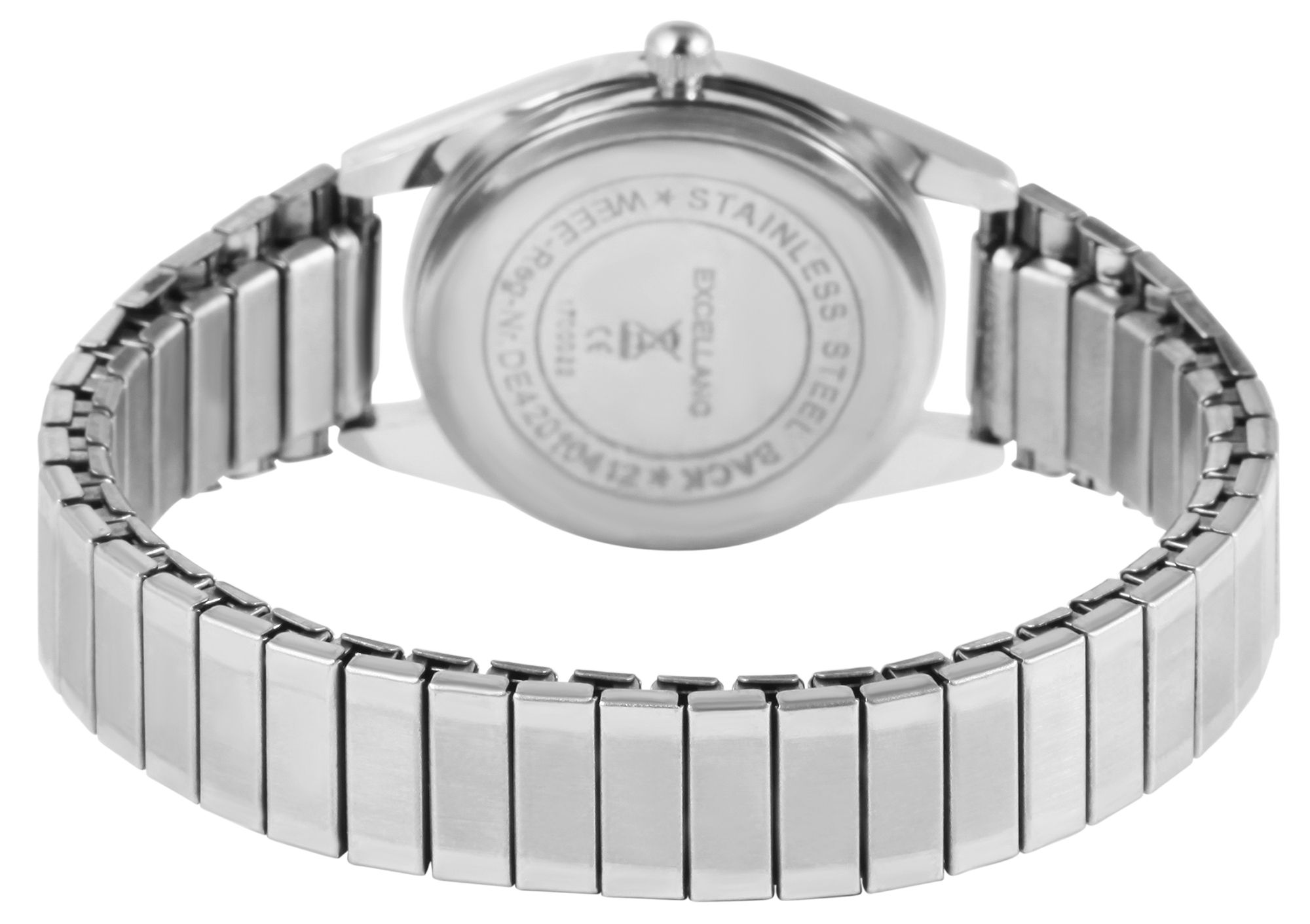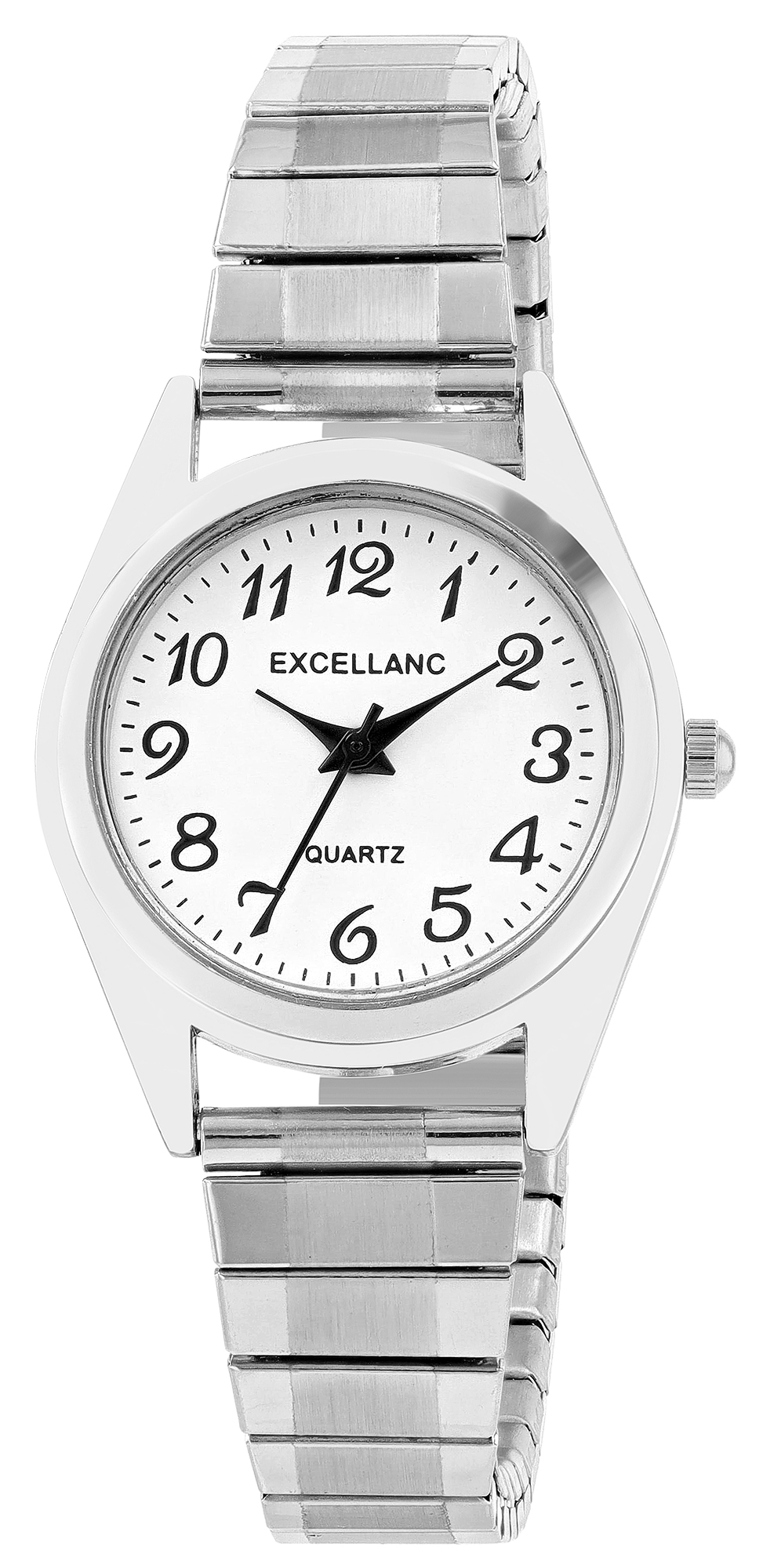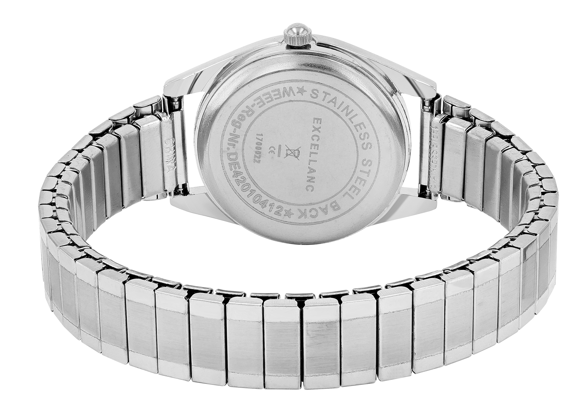 Die analoge 3-Zeiger Damenarmbanduhr der Marke Excellanc verfügt über ein hochwertiges Quarzuhrwerk. Das Edelstahlzugarmband ist am Anstoß 14 mm breit und lässt sich aufgrund des flexiblen Armbandes besonders bequem und einfach über das Handgelenk ziehen. Die Gesamtlänge der Uhr beträgt 20 cm. Das Metallgehäuse mit Mineralglas hat eine Abmessung von 28 mm im Durchmesser und einer Gehäusehöhe von 8 mm. Der Gehäuseboden ist aus Edelstahl gefertigt. Dank des schlichten Zifferblattes und der übersichtlichen Einteilung lässt sich die Uhrzeit schnell auf einen Blick ablesen.