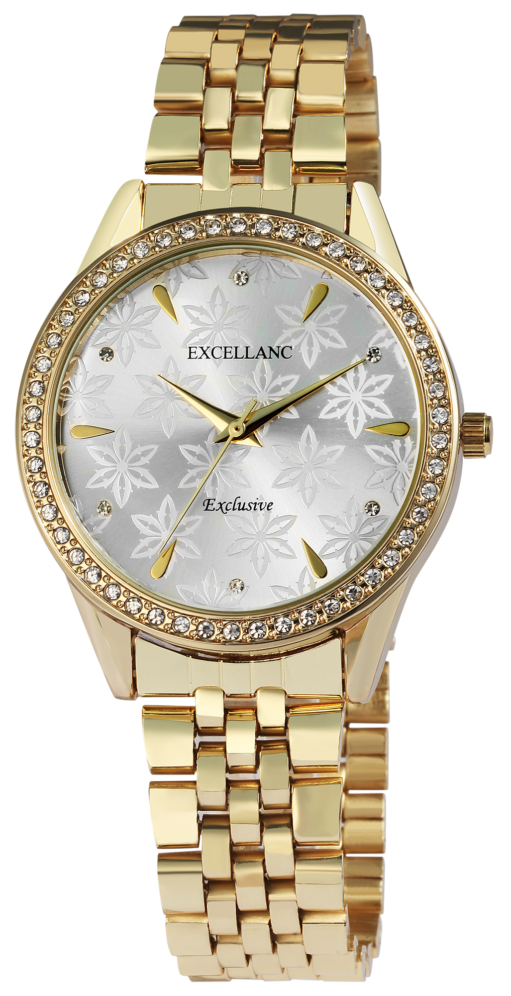 Das Geschenkset der Marke Excellanc besteht aus einer Damenarmbanduhr, einer Halskette und einem Paar Ohrringen. Die Schmuckstücke sind goldfarben, aufeinander abgestimmt und lassen sich wunderbar in Kombination tragen. Die analoge 3-Zeiger Damenarmbanduhr, dessen Lünette rundherum mit funkelnden Similisteinen besetzt ist, verfügt über ein hochwertiges Quarzuhrwerk. Das goldfarbene Metallarmband ist am Anstoß 18 mm breit und lässt sich über eine Faltschließe öffnen und schließen. Die Gesamtlänge der Uhr beträgt 21,5 cm. Das goldfarbene Metallgehäuse mit Mineralglas hat eine Abmessung von 38 mm im Durchmesser und einer Gehäusehöhe von 9 mm. Der Gehäuseboden ist aus Edelstahl gefertigt. In dem silberfarbenen Zifferblatt spiegeln sich die floralen Motive wieder, zudem dienen Similisteine als Punktindexe. Die Zeiger und Indexe sind ebenfalls goldfarben und runden das Gesamtbild harmonisch ab. Die modische Ankerkette ist 46 cm lang und kann bei Bedarf um weitere 6 cm verlängert werden. Verschlossen wird sie mit einem praktischen Karabinerhaken. Zudem wird sie durch einen eleganten Anhänger in Form einer Blume geschmückt, der eine Länge von 36 mm, eine Breite von 31 mm und eine Stärke von 4,5 mm misst. Die Ohrstecker weisen die gleiche Optik des Anhängers auf. Sie haben eine Länge von 21 mm, eine Breite von 18 mm und eine Stärke von 3 mm. Mit einer Ohrmutter können sie am Ohrloch gesichert werden. Wie der Anhänger auch sind die Ohrstecker mit Similisteinen besetzt. Rundum ist das Damenset ein toller Blickfang und eignet sich fantastisch als Geschenk. Geliefert wird das Set in einer hochwertigen Verpackung.