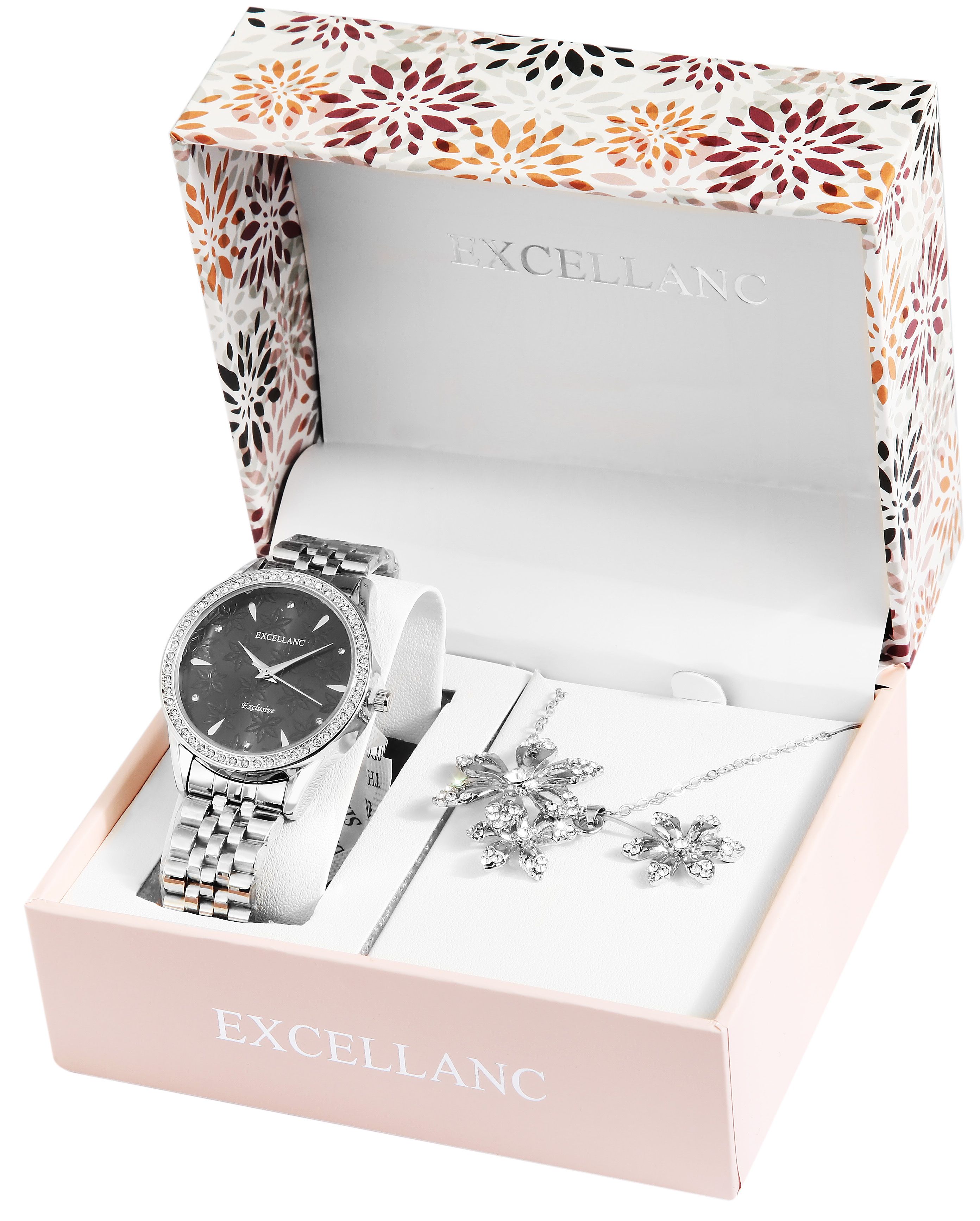 Produktinformationen "Excellanc Geschenkset mit Damenarmbanduhr, Halskette und Ohrringen, silberfarben/schwarz"