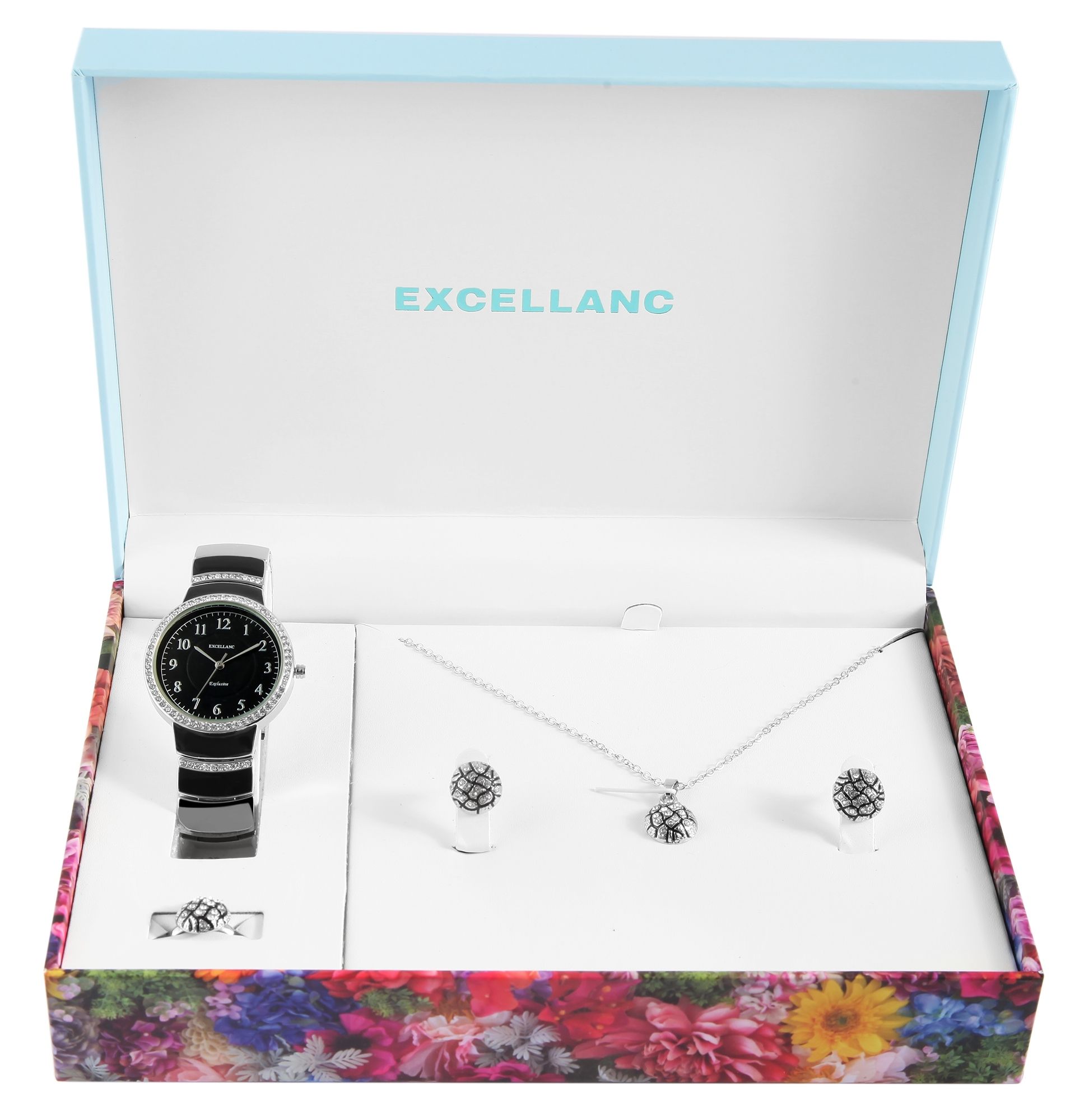 Produktinformationen "Excellanc Geschenkset mit Damenuhr, Halskette, Ring und Ohrsteckern, silberfarben/schwarz"