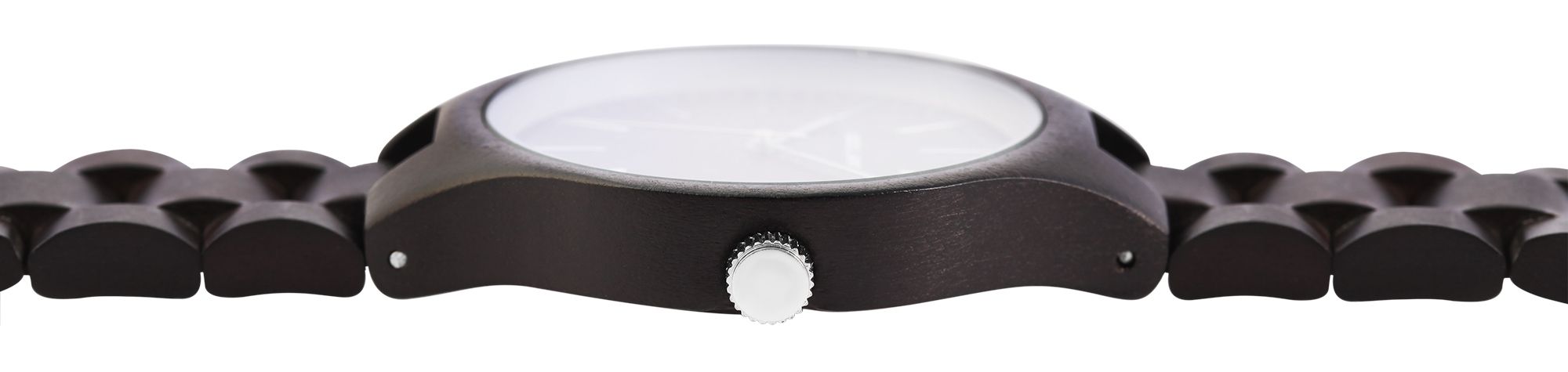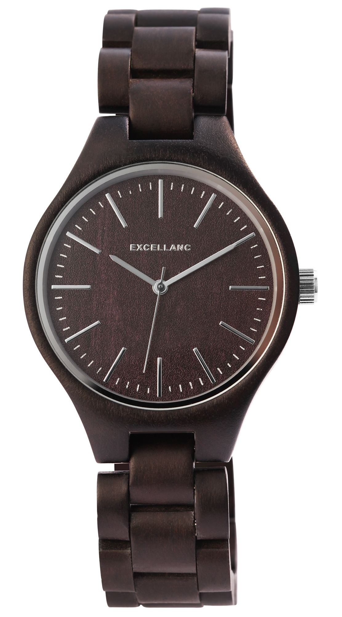 Die analoge 3-Zeiger Herrenarmbanduhr der Marke Excellanc verfügt über ein hochwertiges Quarzuhrwerk. Das Holzarmband aus dunklem Sandelholz ist am Anstoß 20 mm breit und lässt sich mit einer silberfarbenen Edelstahlfaltschließe öffnen und schließen. Die Gesamtlänge der Uhr beträgt 22,5 cm. Das ebenfalls aus dunklem Sandelholz gefertigte Holzgehäuse mit gleichfarbigem Holzgehäuseboden und Mineralglas hat eine Abmessung von 41 mm im Durchmesser und einer Gehäusehöhe von 10 mm. Ein optisches Highlight ist das Mineralglas, welches am äußeren Rand einen silberfarbenen Spiegelrand hat. Dieser verleiht der Uhr zusammen mit der silberfarbenen Krone einen edlen Look. Das Zifferblatt ist ebenfalls aus dunklem Sandelholz gefertigt. Die Zeiger und die Strichindexe sind silberfarben und passen sich optisch gut mit dem Gesamtbild der Uhr an. Holzuhren sind heutzutage ein absolutes Muss an jedem Handgelenk. Durch das Material ist die Uhr nicht nur besonders langlebig, sondern auch ein absoluter Hingucker.