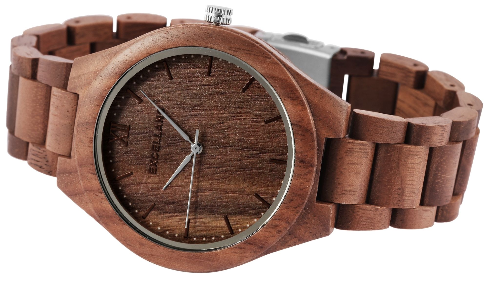 Die analoge 3-Zeiger Herrenarmbanduhr der Marke Excellanc verfügt über ein hochwertiges Quarzuhrwerk. Das Holzarmband ist am Anstoß 22 mm breit und lässt sich mit einer Edelstahlfaltschließe öffnen und schließen. Die Gesamtlänge der Uhr beträgt 23 cm, lässt sich aber aufgrund der herausnehmen Elemente beliebig kürzen. Das ebenfalls aus Holz gefertigte Gehäuse mit gleichfarbigem Holzgehäuseboden und Mineralglas hat eine Abmessung von 45 mm im Durchmesser und einer Gehäusehöhe von 12 mm. Ein optisches Highlight ist das Mineralglas, welches am äußeren Rand einen Spiegelrand hat. Dieser verleiht der Uhr zusammen mit der farblich abgestimmten Krone auf drei Uhr einen edlen Look. Das Zifferblatt ist ebenfalls aus Holz gefertigt. Die Zeiger und die Strichindexe passen sich farblich an und runden das Gesamtbild harmonisch ab. Jede Holzuhr ist in seiner Beschaffenheit einzigartig und individuell. Sie ist ein Statement zum nachhaltigen denken und gleichzeitig ein modisches Accessoire. Die Leichtigkeit des natürlichen Rohstoffes sorgt für einen angenehmen Tragekomfort, sodass sich dieses zeitlose Uhrenmodell nicht mehr wegdenken lässt.