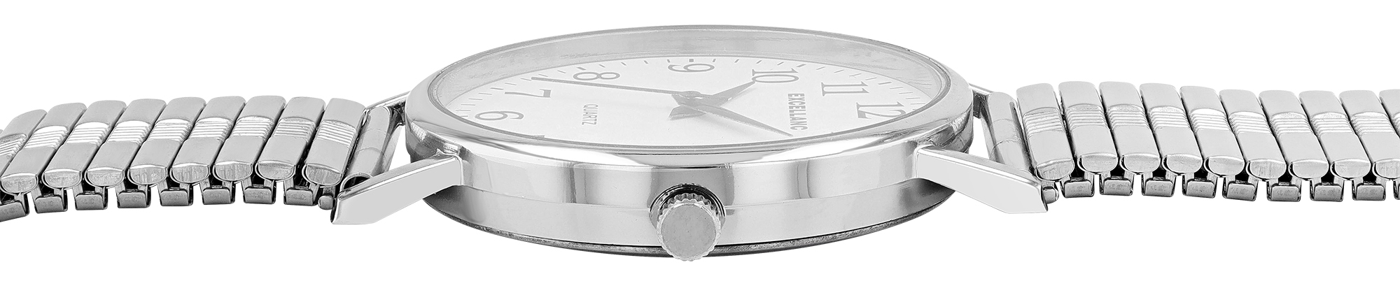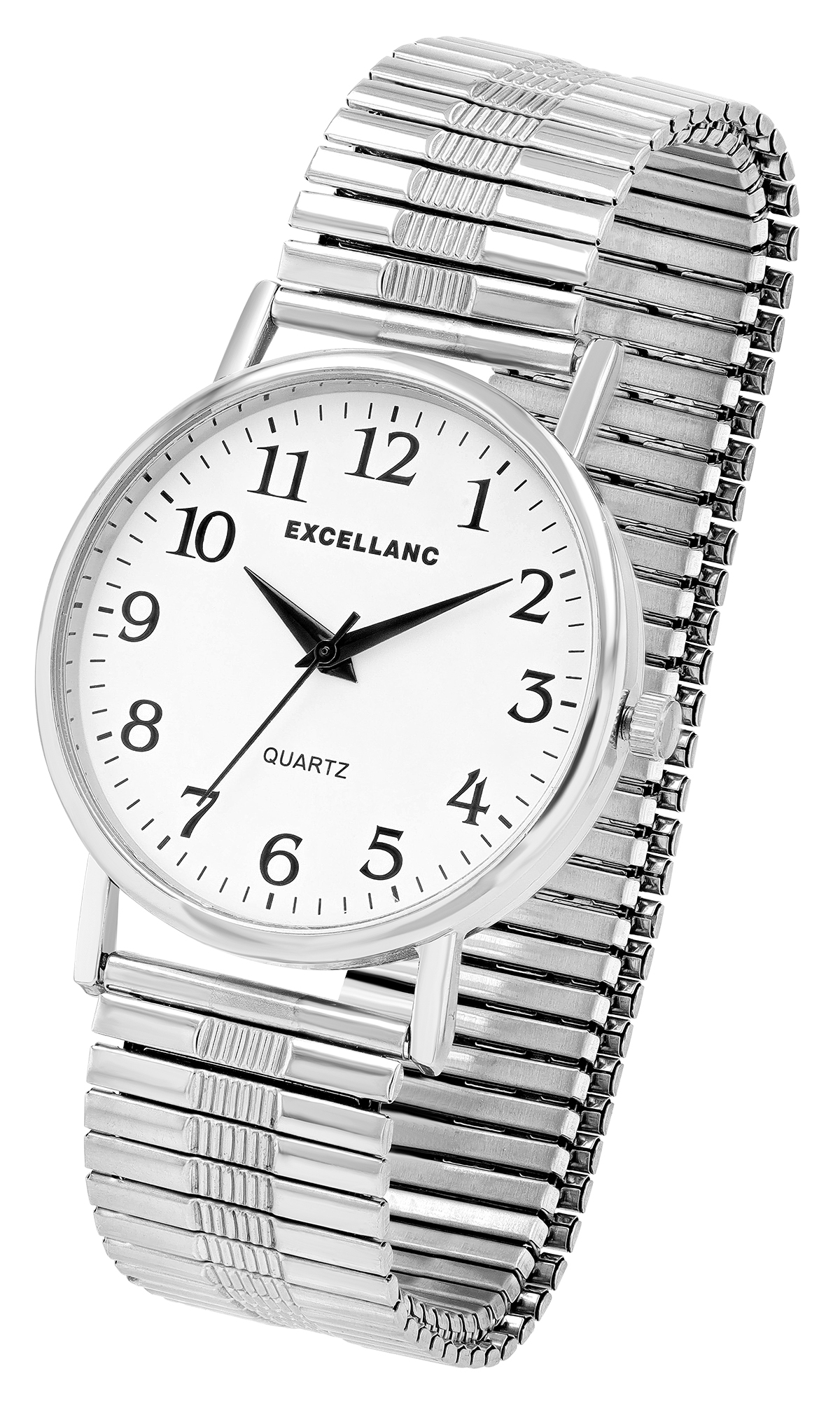 Die analoge 3-Zeiger Herrenarmbanduhr der Marke Excellanc verfügt über ein hochwertiges Quarzuhrwerk. Das Edelstahl-Zugarmband ist am Anstoß 20 mm breit und lässt sich aufgrund des flexiblen Armbandes besonders bequem und einfach über das Handgelenk ziehen. Aufgrund des praktischen Verschlusses lässt sich die Länge individuell jedem Träger anpassen. Die Gesamtlänge der Uhr beträgt ca 20 cm. Das Metallgehäuse mit Mineralglas hat eine Abmessung von 38 mm im Durchmesser und einer Gehäusehöhe von 9 mm. Der Gehäuseboden ist aus Edelstahl gefertigt. Das schlichte Zifferblatt mit übersichtlicher Einteilung hält sich dezent im Hintergrund und verleiht der Uhr gekonnt ein stilsicheres Auftreten. Die großen arabischen Ziffern sorgen für eine leichte Ablesbarkeit der aktuellen Uhrzeit.
