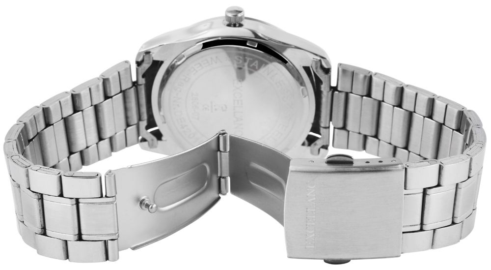 Die Analog Herrenuhr der Marke Excellanc verfügt über ein Hochwertiges Quarzwerk. Das Edelstahlarmband ist 22 mm breit und wird mit einer Edelstahlfaltschließe geöffnet. Die Gesamtlänge beträgt 20 cm. Das Metallgehäuse mit Mineralglas hat eine Abmessung von 39 mm und 11 mm Gehäusehöhe. Der Gehäusedeckel ist aus Edelstahl gefertigt.