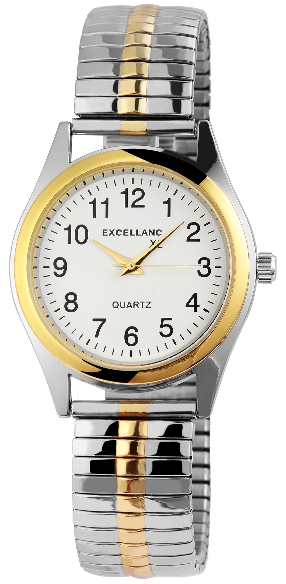 Die silber-und goldfarbene analoge 3-Zeiger Herrenuhr mit Zugarmband der Marke Excellanc verfügt über ein hochwertiges Quarzuhrwerk. Das Zugarmband aus Edelstahl ist am Anstoß 18 mm breit und lässt sich aufgrund des flexiblen Armbandes besonders einfach über das Handgelenk ziehen. Die Uhr bietet mit der Flexibilität und Leichtigkeit einen sehr hohen Tragekomfort. Die Herrenuhr hat eine Gesamtlänge von 22,5 cm. Die Länge des Armbandes ist auf jedes Handgelenk anpassbar. Das Metallgehäuse mit Mineralglas hat eine Abmessung von 36 mm im Durchmesser und eine Gehäusehöhe von 8 mm. Der Gehäuseboden ist aus Edelstahl gefertigt. Mit dem schlicht eleganten Look, ist diese Uhr mit jedem Outfit gut kombinierbar.