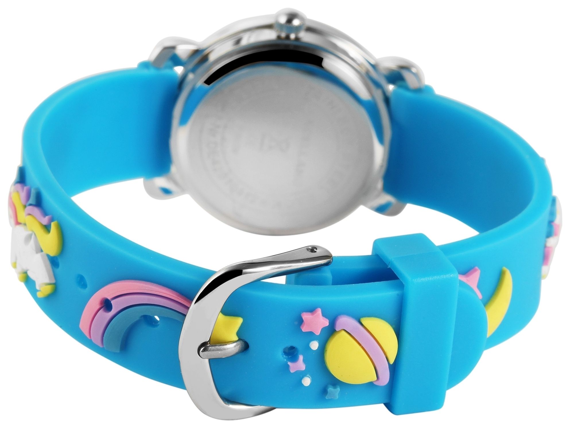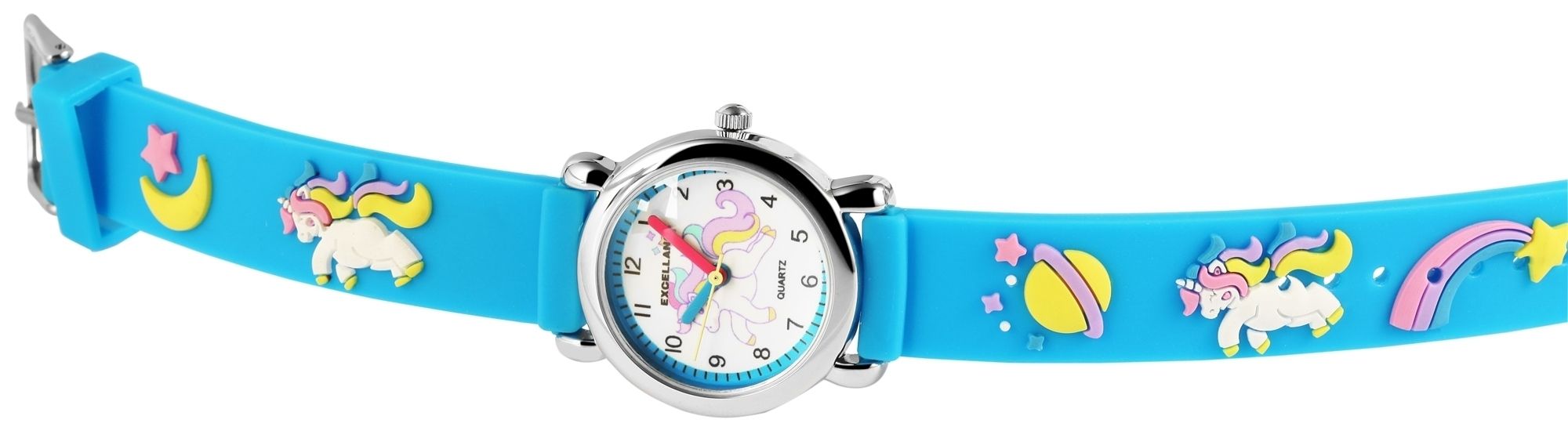 Die analoge 3-Zeiger Kinderarmbanduhr der Marke Excellanc verfügt über das hochwertige Quarzuhrwerk PC21. Das blaue Silikonarmband ist am Anstoß 14 mm breit und lässt sich mit einer silberfarbenen Dornschließe öffnen und schließen. Die Gesamtlänge der Uhr beträgt 20 cm. Das silberfarbene Metallgehäuse mit Mineralglas hat eine Abmessung von 27 mm im Durchmesser und einer Gehäusehöhe von 10 mm. Der Gehäuseboden ist aus Edelstahl gefertigt. Das farbenfrohe Kautschukarmband ist mit zwei großen Einhörnern und verschiedenen bunten Motiven aus dem Sonnensystem verziert und sorgt für einen angenehmen Tragekomfort. Das Zifferblatt ist weiß und mit schwarzen Ziffern und Indexen bedruckt. Außerdem ist auf dem Zifferblatt ebenfalls ein großes Einhornmotiv abgebildet. Der Stundenzeiger ist blau, der Minutenzeiger ist rot und der Sekundenzeiger ist gelb. Das vereinfacht das Lernen und Ablesen der Uhrzeit.