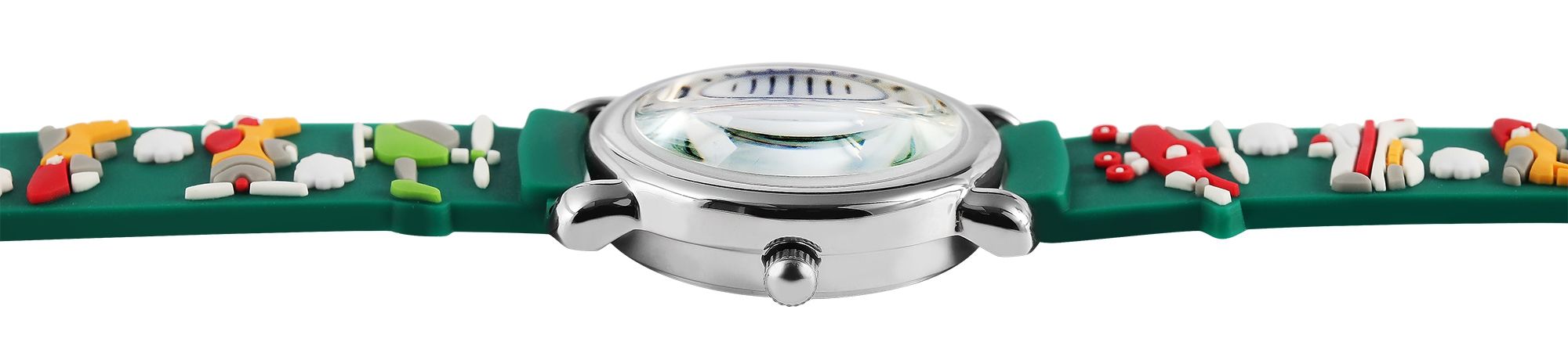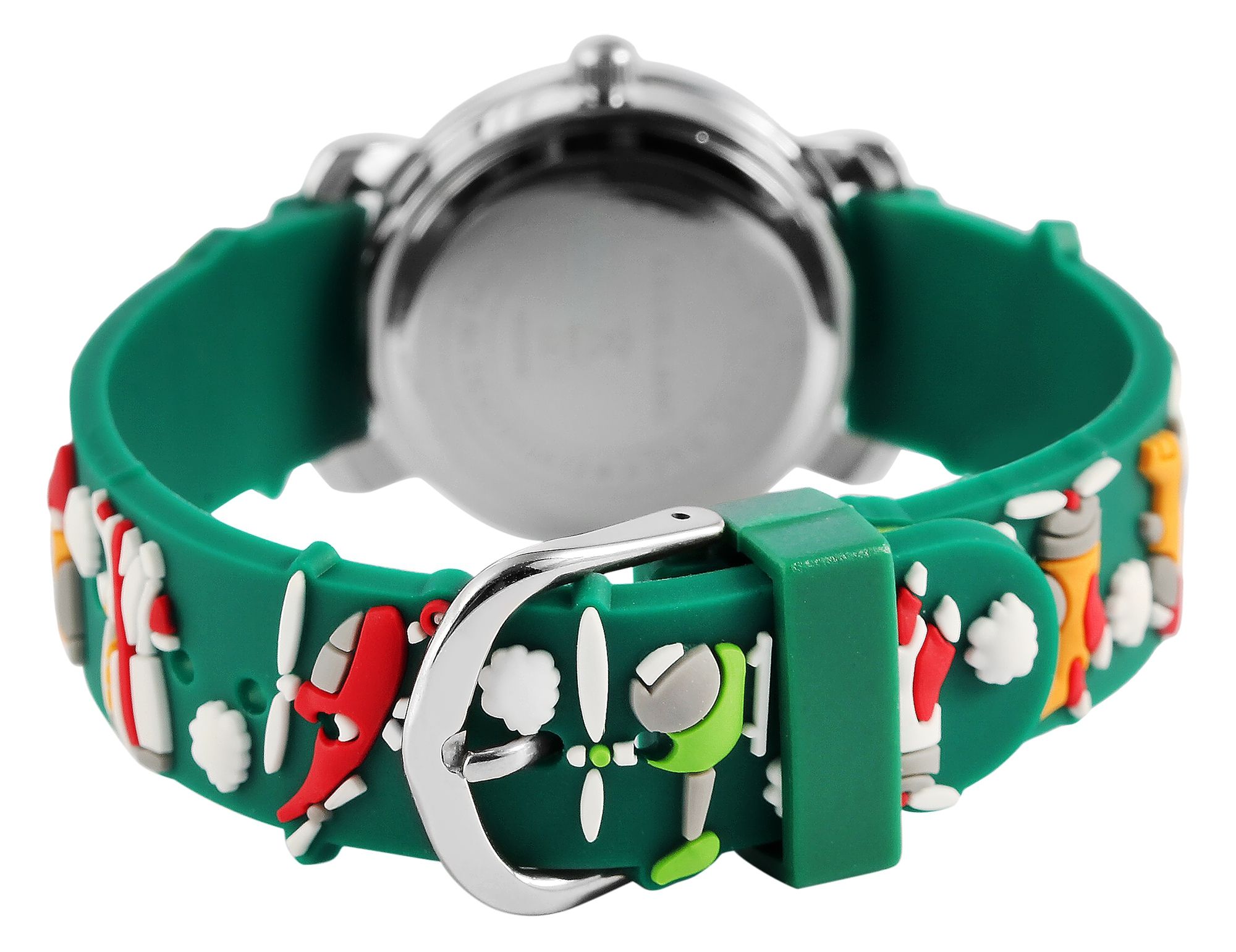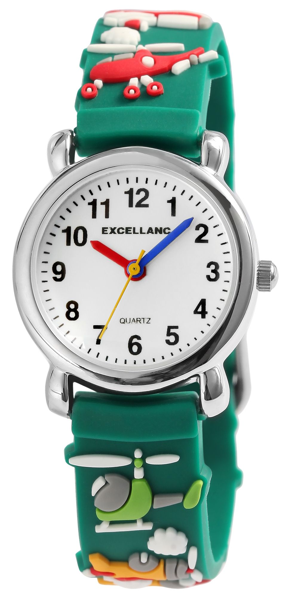 Die analoge 3-Zeiger Kinderarmbanduhr der Marke Excellanc verfügt über das hochwertige Quarzuhrwerk PC21. Das Silikonarmband ist am Anstoß 14 mm breit und lässt sich mit einer Dornschließe öffnen und schließen. Die Gesamtlänge der Uhr beträgt 20 cm. Das silberfarbene Metallgehäuse mit Mineralglas hat eine Abmessung von 27 mm im Durchmesser und einer Gehäusehöhe von 10 mm. Der Gehäuseboden ist aus Edelstahl gefertigt. Das grüne Kautschukarmband ist mit verschiedenen Flugzeugmotiven verziert und sorgt für einen angenehmen Tragekomfort. Das Zifferblatt ist weiß und mit schwarzen Ziffern bedruckt. Der Stundenzeiger ist rot und der Minutenzeiger ist blau. Die Sekunden werden mit einem gelben Zeiger angezeigt.
