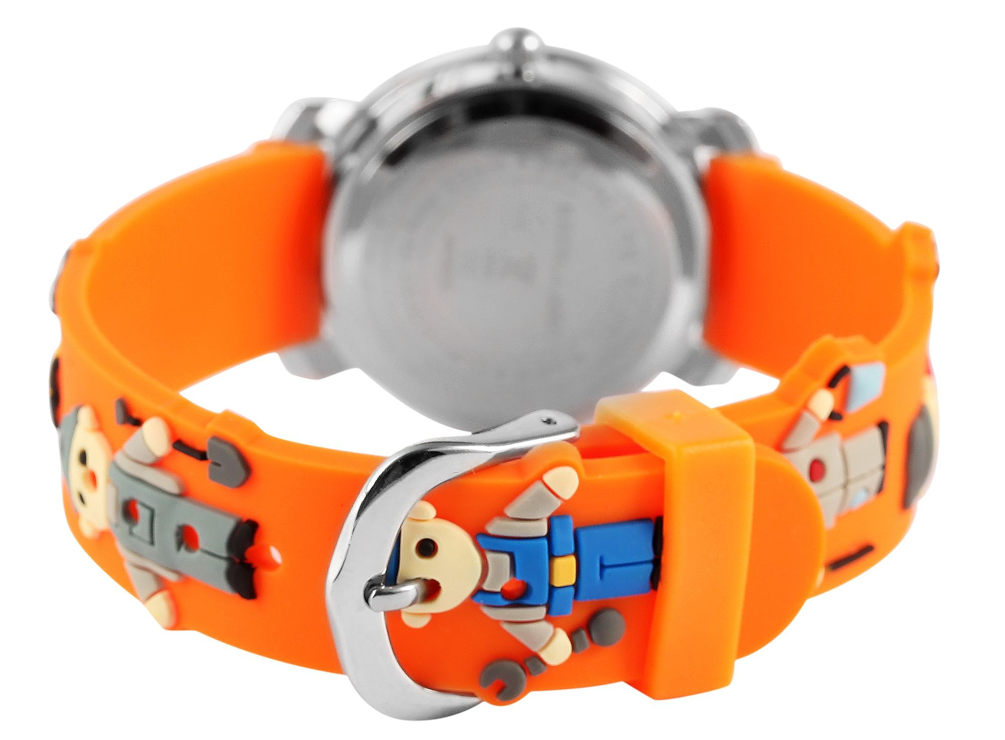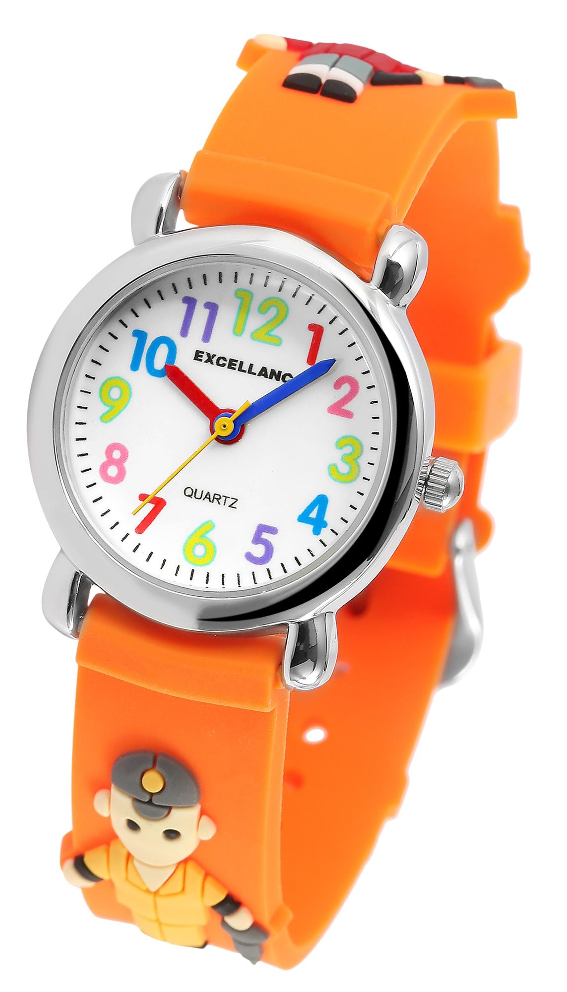 Die analoge 3-Zeiger Kinderarmbanduhr der Marke Excellanc verfügt über das hochwertige Quarzuhrwerk PC21. Das Silikonarmband ist am Anstoß 14 mm breit und lässt sich mit einer Dornschließe öffnen und schließen. Die Gesamtlänge der Uhr beträgt 20 cm. Das silberfarbene Metallgehäuse mit Mineralglas hat eine Abmessung von 27 mm im Durchmesser und einer Gehäusehöhe von 10 mm. Der Gehäuseboden ist aus Edelstahl gefertigt. Das orangefarbene Kautschukarmband ist mit verschiedenen Handwerkermotiven verziert und sorgt für einen angenehmen Tragekomfort. Das weiße Zifferblatt ist mit bunten Ziffern bedruckt. Der Stundenzeiger ist rot und der Minutenzeiger ist blau. Die Sekunden werden mit einem gelben Zeiger angezeigt.