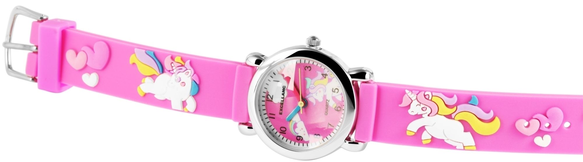Die analoge 3-Zeiger Kinderarmbanduhr der Marke Excellanc verfügt über das hochwertige Quarzuhrwerk PC21. Das pinke Silikonarmband ist am Anstoß 14 mm breit und lässt sich mit einer silberfarbenen Dornschließe öffnen und schließen. Die Gesamtlänge der Uhr beträgt 20 cm. Das silberfarbene Metallgehäuse mit Mineralglas hat eine Abmessung von 27 mm im Durchmesser und einer Gehäusehöhe von 10 mm. Der Gehäuseboden ist aus Edelstahl gefertigt. Das farbenfrohe Kautschukarmband ist mit bunten Einhornmotiven verziert und sorgt für einen angenehmen Tragekomfort. Das Zifferblatt ist ebenfalls pink und ist mit schwarzen Ziffern und Indexen bedruckt. Außerdem finden sich auf dem Zifferblatt auch die Motive des Armbandes wieder. Der Stundenzeiger ist blau, der Minutenzeiger ist rot und der Sekundenzeiger ist gelb. Das vereinfacht das Lernen und Ablesen der Uhrzeit.