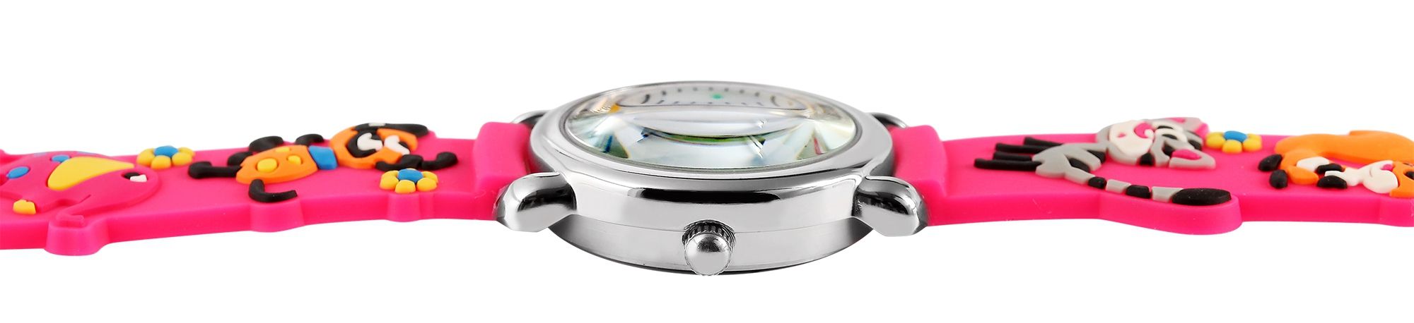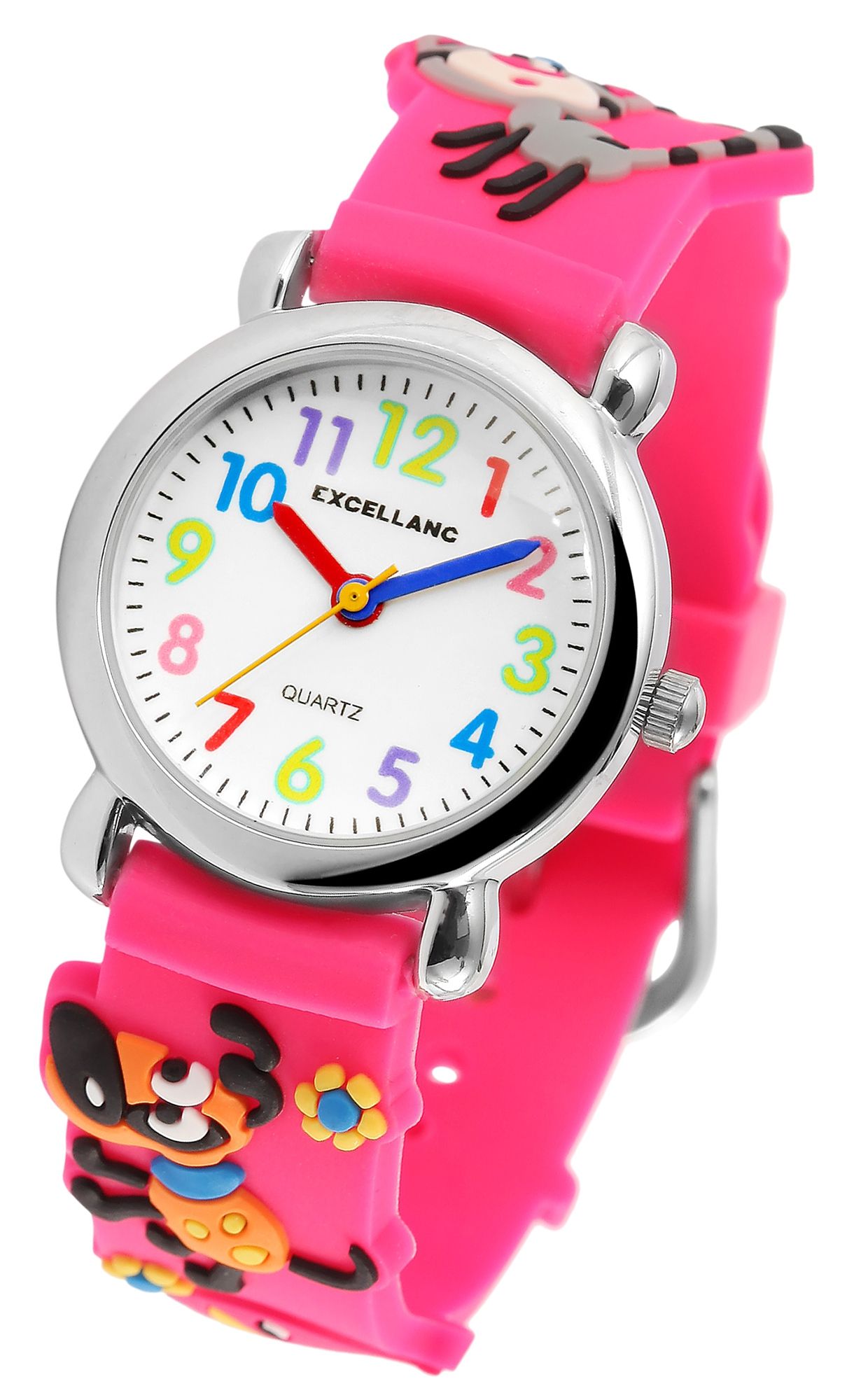 Die analoge 3-Zeiger Kinderarmbanduhr der Marke Excellanc verfügt über das hochwertige Quarzuhrwerk PC21. Das Silikonarmband ist am Anstoß 14 mm breit und lässt sich mit einer Dornschließe öffnen und schließen. Die Gesamtlänge der Uhr beträgt 20 cm. Das silberfarbene Metallgehäuse mit Mineralglas hat eine Abmessung von 27 mm im Durchmesser und einer Gehäusehöhe von 10 mm. Der Gehäuseboden ist aus Edelstahl gefertigt. Das pinke Kautschukarmband ist mit Tiermotiven verziert und sorgt für einen angenehmen Tragekomfort. Das weiße Zifferblatt ist mit bunten Ziffern bedruckt. Der Stundenzeiger ist rot und der Minutenzeiger ist blau. Die Sekunden werden mit einem gelben Zeiger angezeigt.