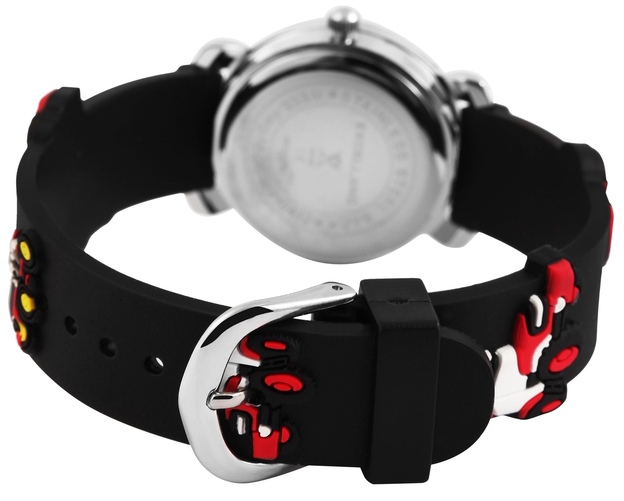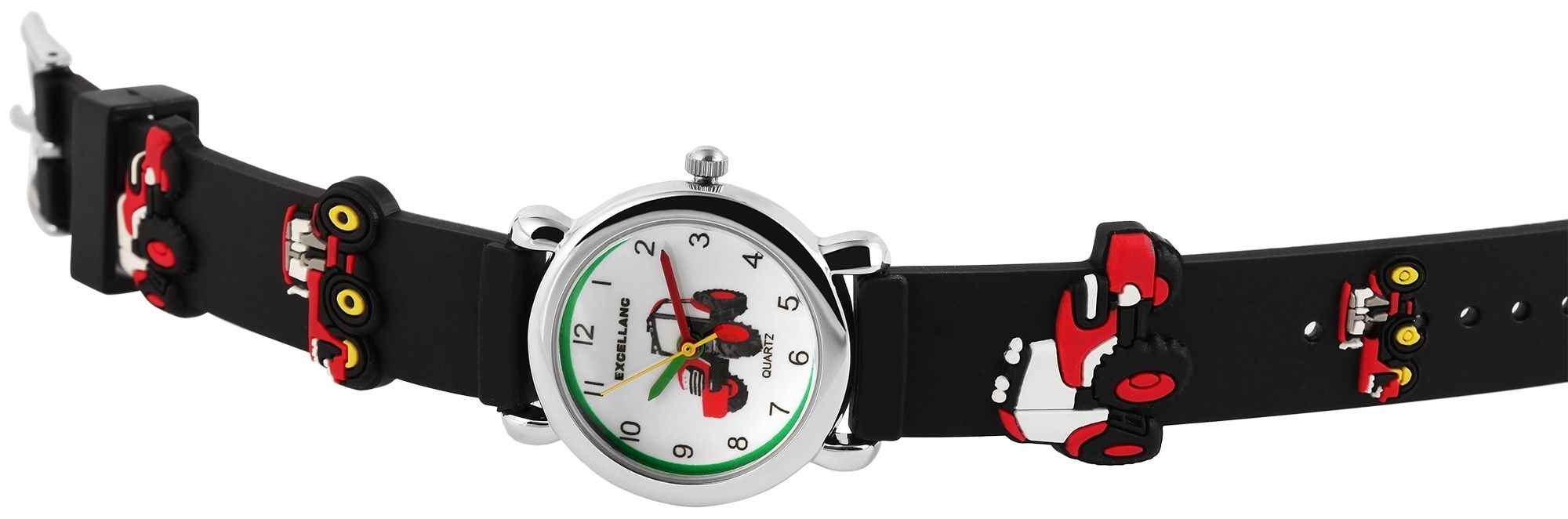 Die analoge 3-Zeiger Kinderarmbanduhr der Marke Excellanc verfügt über das hochwertige Quarzuhrwerk PC21. Das schwarze Silikonarmband ist am Anstoß 14 mm breit und lässt sich mit einer silberfarbenen Dornschließe öffnen und schließen. Die Gesamtlänge der Uhr beträgt 20 cm. Das silberfarbene Metallgehäuse mit Mineralglas hat eine Abmessung von 27 mm im Durchmesser und einer Gehäusehöhe von 10 mm. Der Gehäuseboden ist aus Edelstahl gefertigt. Das schwarze Kautschukarmband ist mit verschiedenen roten Traktormotiven verziert und sorgt für einen angenehmen Tragekomfort. Das Zifferblatt ist weiß und mit schwarzen Ziffern bedruckt. Zusätzlich ist das Zifferblatt mit einem grünen Streifen am äußeren Rand und mittig mit einem großen roten Traktormotiv verziert. Der Stundenzeiger ist grün, der Minutenzeiger ist rot und der Sekundenzeiger ist gelb. Dies vereinfacht das Lernen und Ablesen der Uhrzeit.