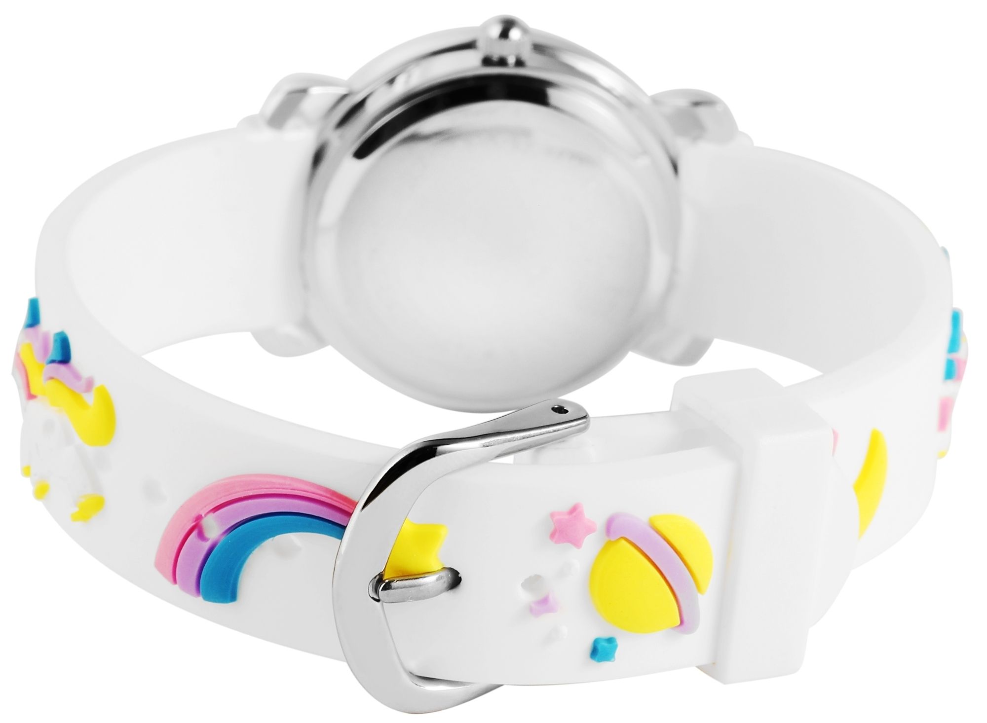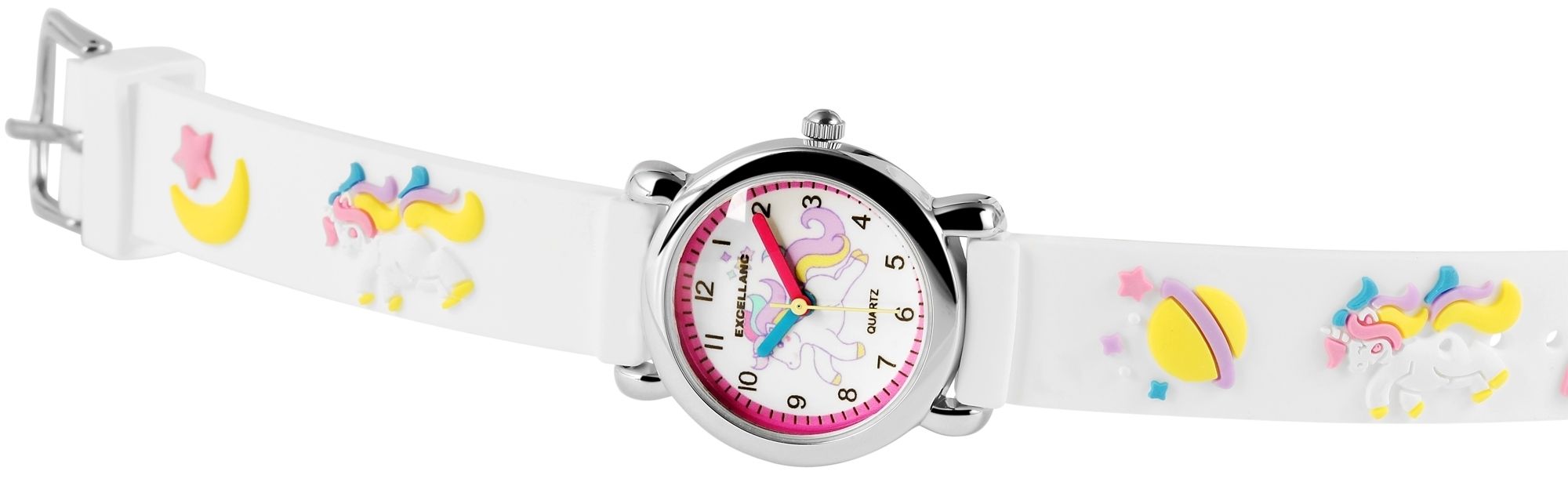Die analoge 3-Zeiger Kinderarmbanduhr der Marke Excellanc verfügt über das hochwertige Quarzuhrwerk PC21. Das weiße Silikonarmband ist am Anstoß 14 mm breit und lässt sich mit einer silberfarbenen Dornschließe öffnen und schließen. Die Gesamtlänge der Uhr beträgt 20 cm. Das silberfarbene Metallgehäuse mit Mineralglas hat eine Abmessung von 27 mm im Durchmesser und einer Gehäusehöhe von 10 mm. Der Gehäuseboden ist aus Edelstahl gefertigt. Das farbenfrohe Kautschukarmband ist mit zwei großen Einhörnern und verschiedenen bunten Motiven aus dem Sonnensystem verziert und sorgt für einen angenehmen Tragekomfort. Das Zifferblatt ist weiß und mit schwarzen Ziffern und Indexen bedruckt. Außerdem ist auf dem Zifferblatt ebenfalls ein großes Einhornmotiv abgebildet. Der Stundenzeiger ist blau, der Minutenzeiger ist rot und der Sekundenzeiger ist gelb. Das vereinfacht das Lernen und Ablesen der Uhrzeit.