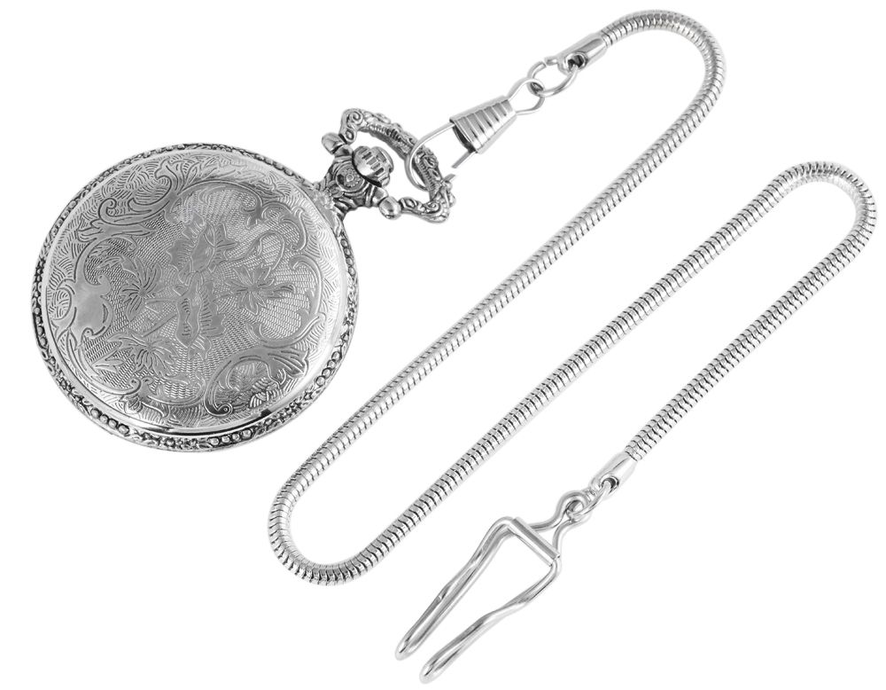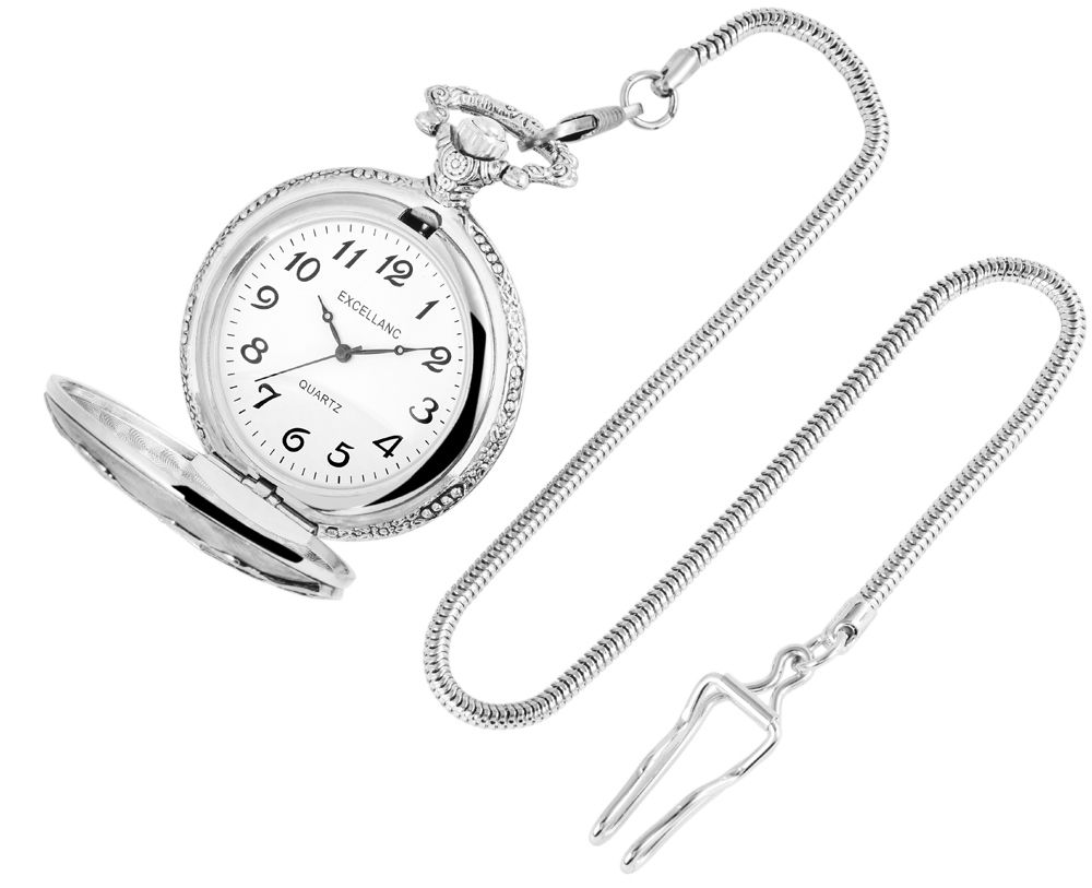 Die analoge 3-Zeiger Taschenuhr der Marke Excellanc verfügt über ein hochwertiges Quarzuhrwerk. Das runde silberfarbene Metallgehäuse ist rückseitig mit einem floralen Muster verziert. Die vordere matte Seite ist mittig mit einem goldfarbenen Lkw vor einem Gebirgszug verziert. Öffnen lässt sich die klassische Taschenuhr mit einem Druckknopf, der mit in die Krone integriert ist. An die Taschenuhr ist eine 30 cm lange Taschenuhrkette im Schlangenmuster angebracht, mit der sie sich sicher an der Tasche oder am Kleidungsstück befestigen lässt. Das Zifferblatt der Uhr ist weiß und mit großen schwarzen arabischen Ziffern ausgestattet. Diese unterstreichen den klassischen Look der Taschenuhr und machen das Ablesen der Uhrzeit besonders leicht. Außerdem ist die Uhr mit einem leicht gewölbten Kunststoffglas ausgestattet. Die Maße der Uhr ergeben sich aus einem Durchmesser von 47 mm und einer Gehäusehöhe von 16 mm.