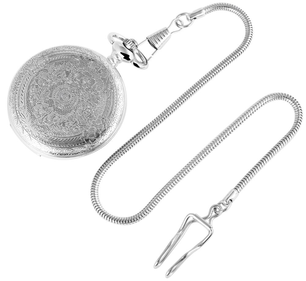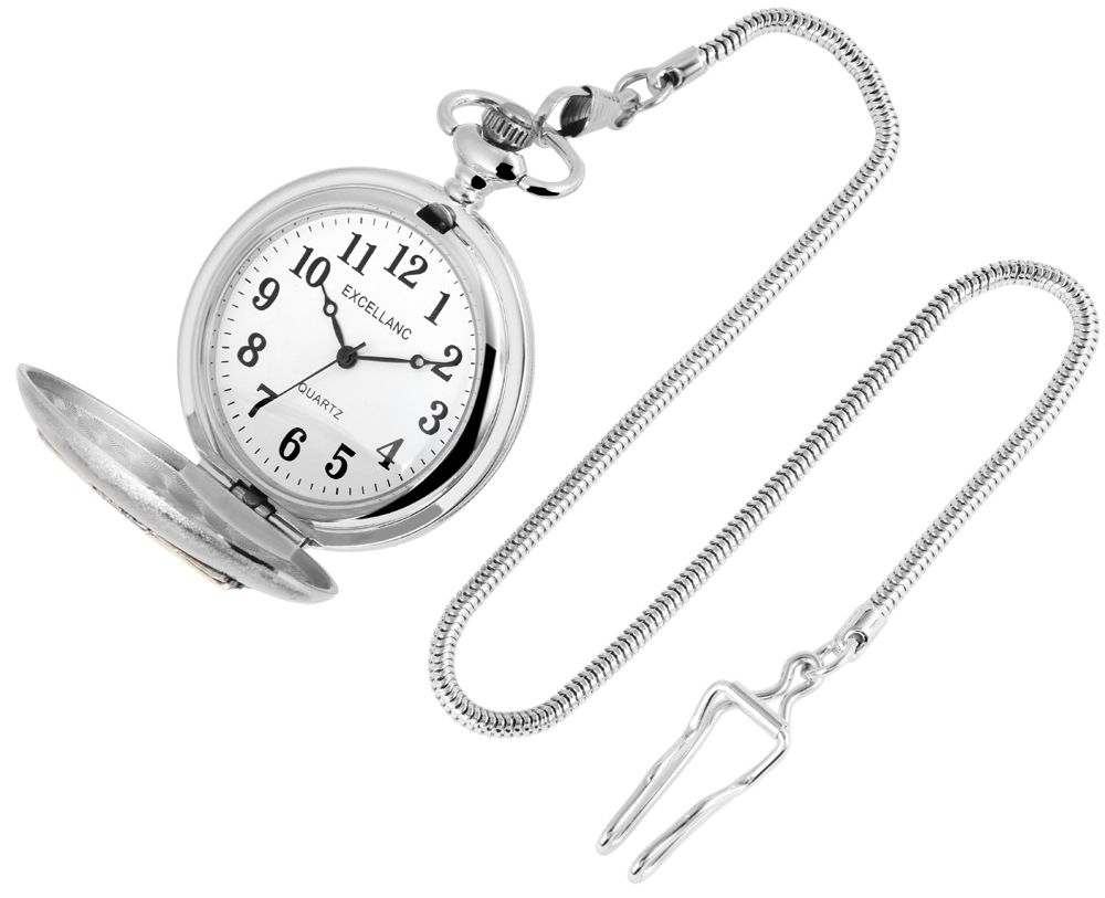 Die analoge 3-Zeiger Taschenuhr der Marke Excellanc verfügt über ein hochwertiges Quarzuhrwerk. Das runde silberfarbene Metallgehäuse ist rückseitig mit einem floralen Muster verziert. Die vordere matte Seite ist mittig mit dem Brandenburger Tor, welches goldfarben ist, verziert. Öffnen lässt sich die klassische Taschenuhr mit einem Druckknopf, der mit in die Krone integriert ist. An die Taschenuhr ist eine 30 cm lange Taschenuhrkette im Schlangenmuster angebracht, mit der sie sich sicher an der Tasche oder am Kleidungsstück befestigen lässt. Das Zifferblatt der Uhr ist weiß und mit großen schwarzen arabischen Ziffern ausgestattet. Diese unterstreichen den klassischen Look der Taschenuhr und machen das Ablesen der Uhrzeit besonders leicht. Außerdem ist die Uhr mit einem leicht gewölbten Kunststoffglas ausgestattet. Die Maße der Uhr ergeben sich aus einem Durchmesser von 47 mm und einer Gehäusehöhe von 16 mm.
