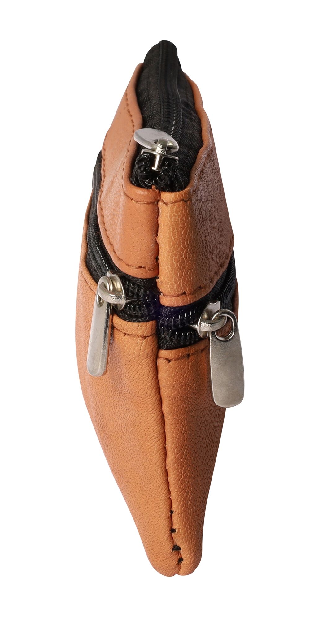 Der cognacfarbene Schlüsselbeutel der Marke Excellanc wurde aus Echtleder hergestellt. Das Innenfutter besteht aus Polyester. Die Naht, mit der das Etui vernäht ist und für Stabilität und Halt sorgt, ist ebenfalls cognacfarben. An dem Schlüsselbeutel sind zwei praktische Schlüsselringe mit einem Durchmesser von 25 mm angebracht. Einer davon ist im Inneren des Beutels an einem 4 cm langen Lederriemen angebracht. Der andere Schlüsselring ist außen an einem 2 cm langen Lederstück befestigt. Sie eignen sich hervorragend zum Anbringen von Schlüsseln oder Anhängern, aber auch zum Befestigen an Taschen oder Schlüsselbrettern. Das Schlüsseletui verfügt über ein großes Innenfach und zwei Reißverschlussfächer außen. Das Etui hat eine Länge von 8 cm, eine Breite von 11,4 cm und eine Stärke von 1 cm. Der Schlüsselbeutel ist perfekt um Schlüssel zu verstauen. Kleingeld, aber auch Karten können bequem untergebracht werden. Klein, aber mit großer Wirkung überzeugt das klassische Schlüsseletui.