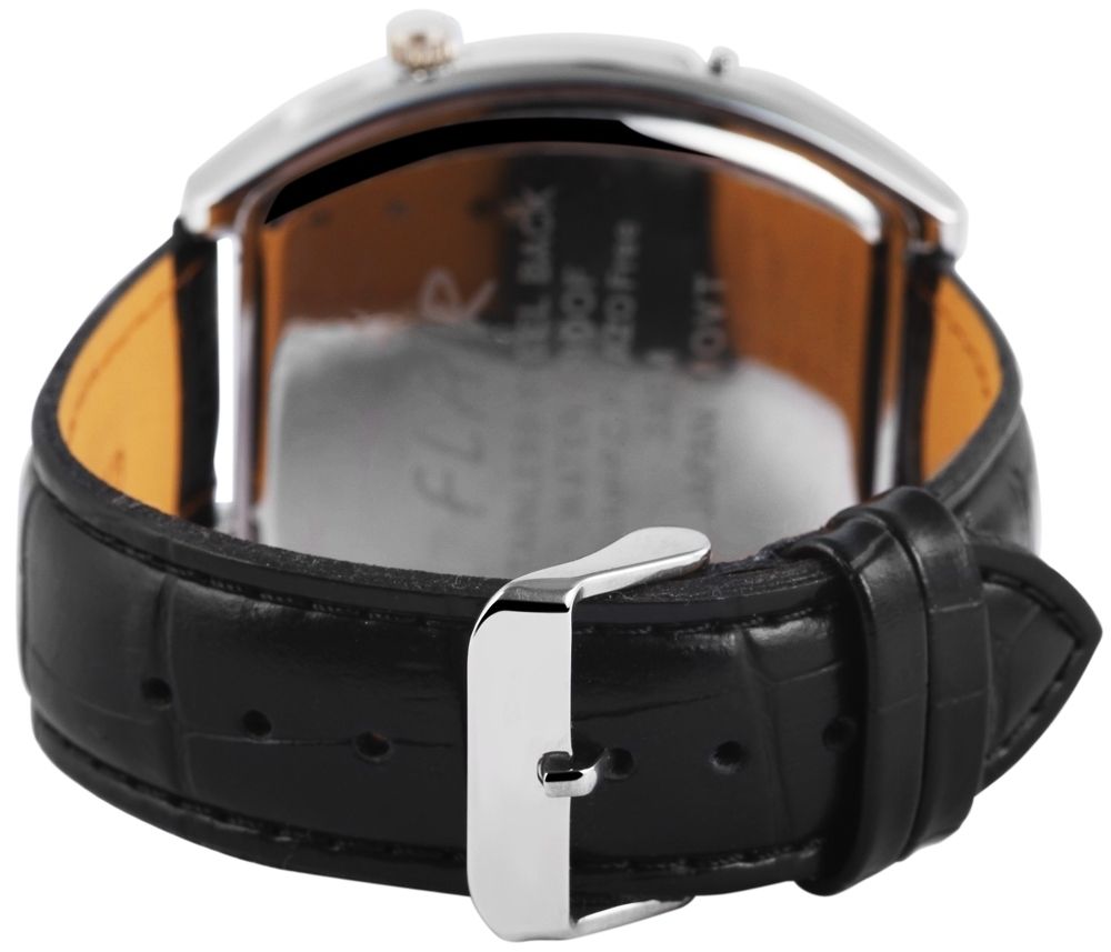 Die Analog Herrenuhr der Marke Flair verfügt über ein Hochwertiges Quarzwerk. Das Echtlederarmband ist 22 mm breit und wird mit einer Dornschließe geöffnet. Die Gesamtlänge beträgt 24 cm. Das Metallgehäuse mit Mineralglas hat eine Abmessung von 45x45 mm und 14 mm Gehäusehöhe. Der Gehäusedeckel ist aus Edelstahl gefertigt. Ein optisches Highlight ist auch der Crystal-Besatz auf dem Zifferblatt. Die Uhr ist 3 ATM druckgeprüft. Die Flair Herrenuhr hat folgende Eigenschaften: 3 Zeitzonen.
