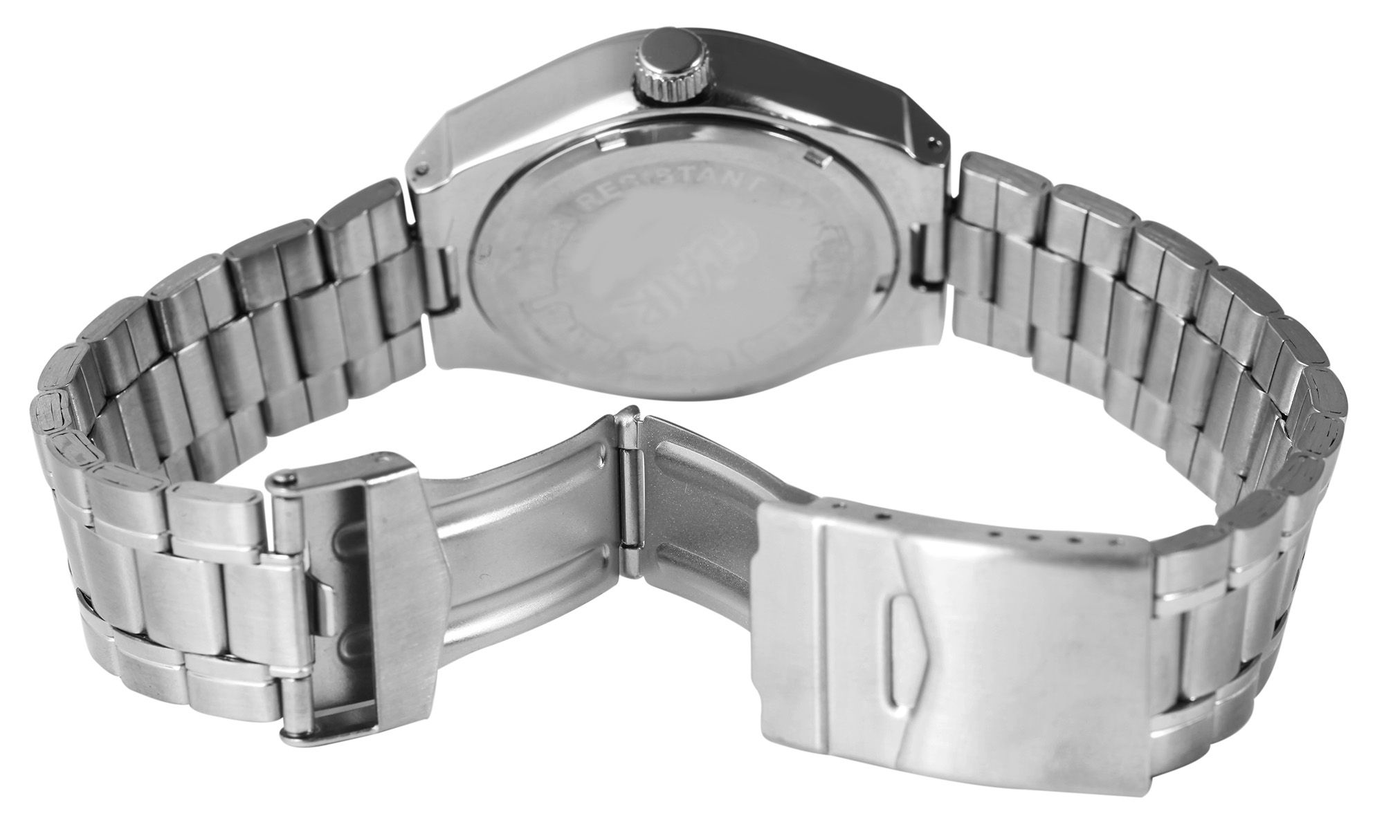 Die analoge 3-Zeiger Herrenarmbanduhr der Marke Flair verfügt über ein hochwertiges und ganggenaues Quarzuhrwerk. Das Edelstahlarmband ist im Anstoß 18 mm breit und lässt sich über eine Edelstahlfaltschließe öffnen und schließen. Das Uhrenarmband ist besonders robust und langlebig und lässt sich aufgrund der herausnehmbaren Elemente mithilfe eines passenden Werkzeuges beliebig kürzen. Die Kombination aus mattierten und glänzenden Uhrenelementen machen die Uhr dabei zu einem besonderen Accessoire. Die Gesamtlänge beträgt 23,5 cm. Das Uhrengehäuse mit Mineralglas hat eine Abmessung 38 x 39 x 11 mm. Der Gehäuseboden ist ebenfalls aus Edelstahl gefertigt und die Uhr hat eine Wasserdichtigkeit von 5 bar. Zudem befindet sich auf sechs Uhr eine Datumsanzeige. Rundum ist dieser Zeitmesser ein gelungenes und zuverlässiges Accessoire, das sich zu zahlreichen Gelegenheiten ausführen lässt.