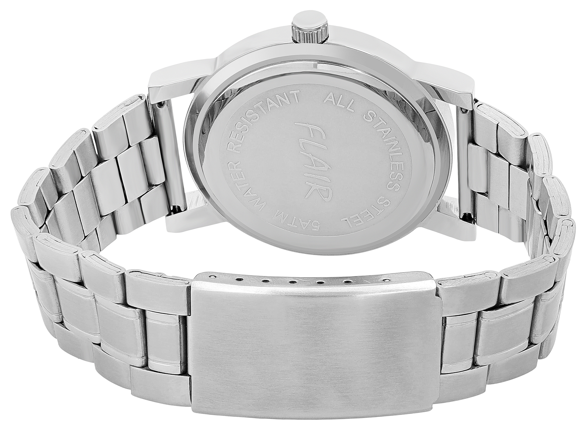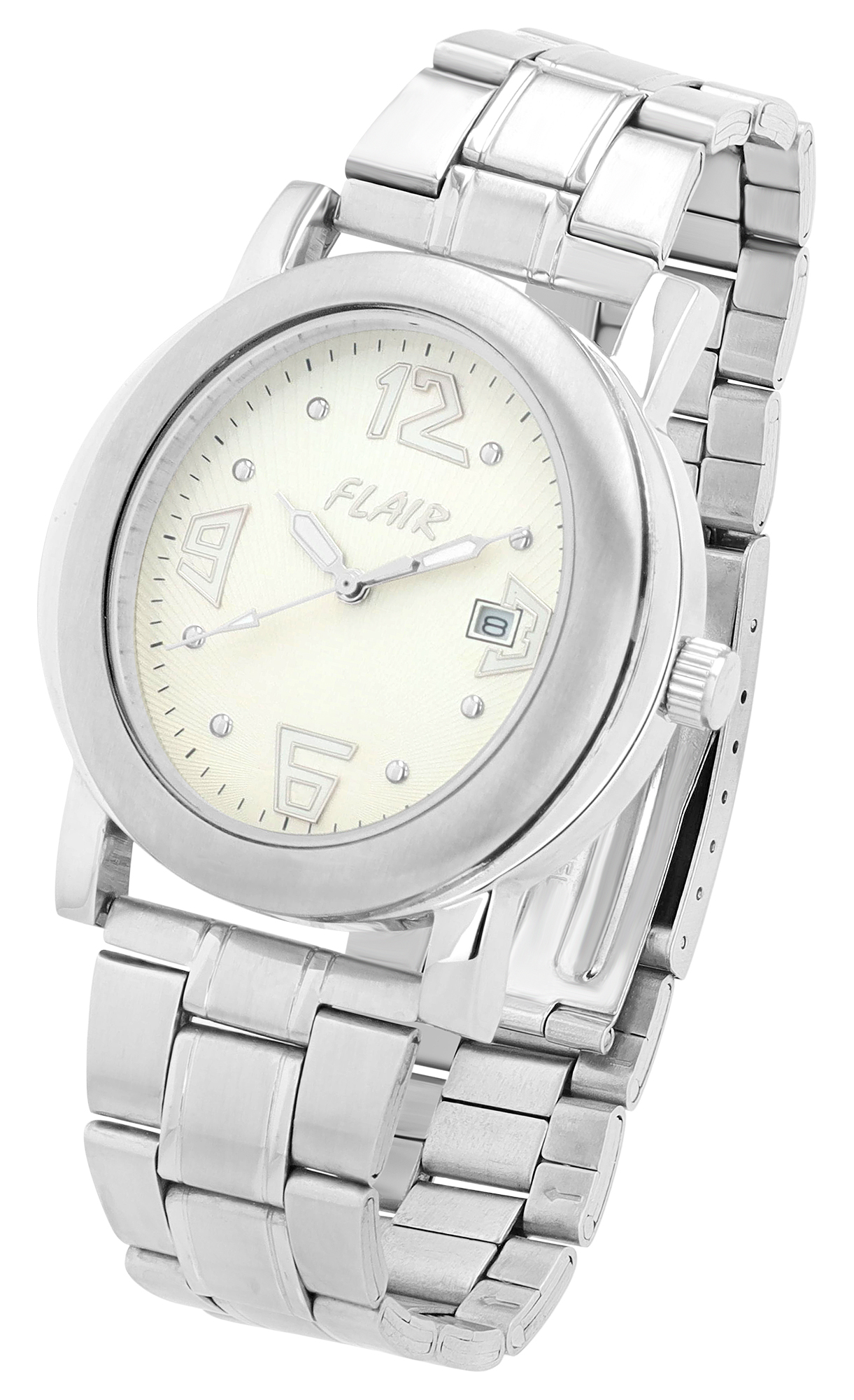 Die Analog Herrenuhr der Marke Flair verfügt über ein Hochwertiges Quarzwerk. Das Edelstahlarmband ist 20 mm breit und wird mit einer Edelstahlfaltschließe geöffnet. Die Gesamtlänge beträgt 22 cm. Das Edelstahlgehäuse mit Mineralglas hat eine Abmessung von 42 mm und 11 mm Gehäusehöhe. Der Gehäusedeckel ist aus Edelstahl gefertigt. Die Uhr ist 5 ATM druckgeprüft. Die Flair Herrenuhr hat folgende Eigenschaften: Datumsanzeige.