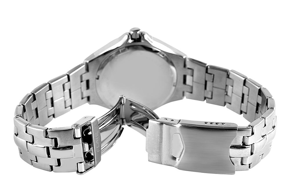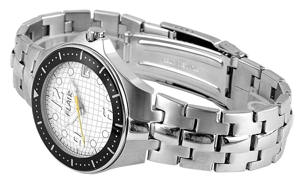 Die Analog Herrenuhr der Marke Flair verfügt über ein Hochwertiges Quarzwerk. Das Edelstahlarmband ist 18 mm breit und wird mit einer Edelstahlfaltschließe geöffnet. Die Gesamtlänge beträgt 21 cm. Das Edelstahlgehäuse mit Mineralglas hat eine Abmessung von 38 mm und 11 mm Gehäusehöhe. Der Gehäusedeckel ist aus Edelstahl gefertigt. Die Uhr ist 5 ATM druckgeprüft. Die Flair Herrenuhr hat folgende Eigenschaften: Datumsanzeige.