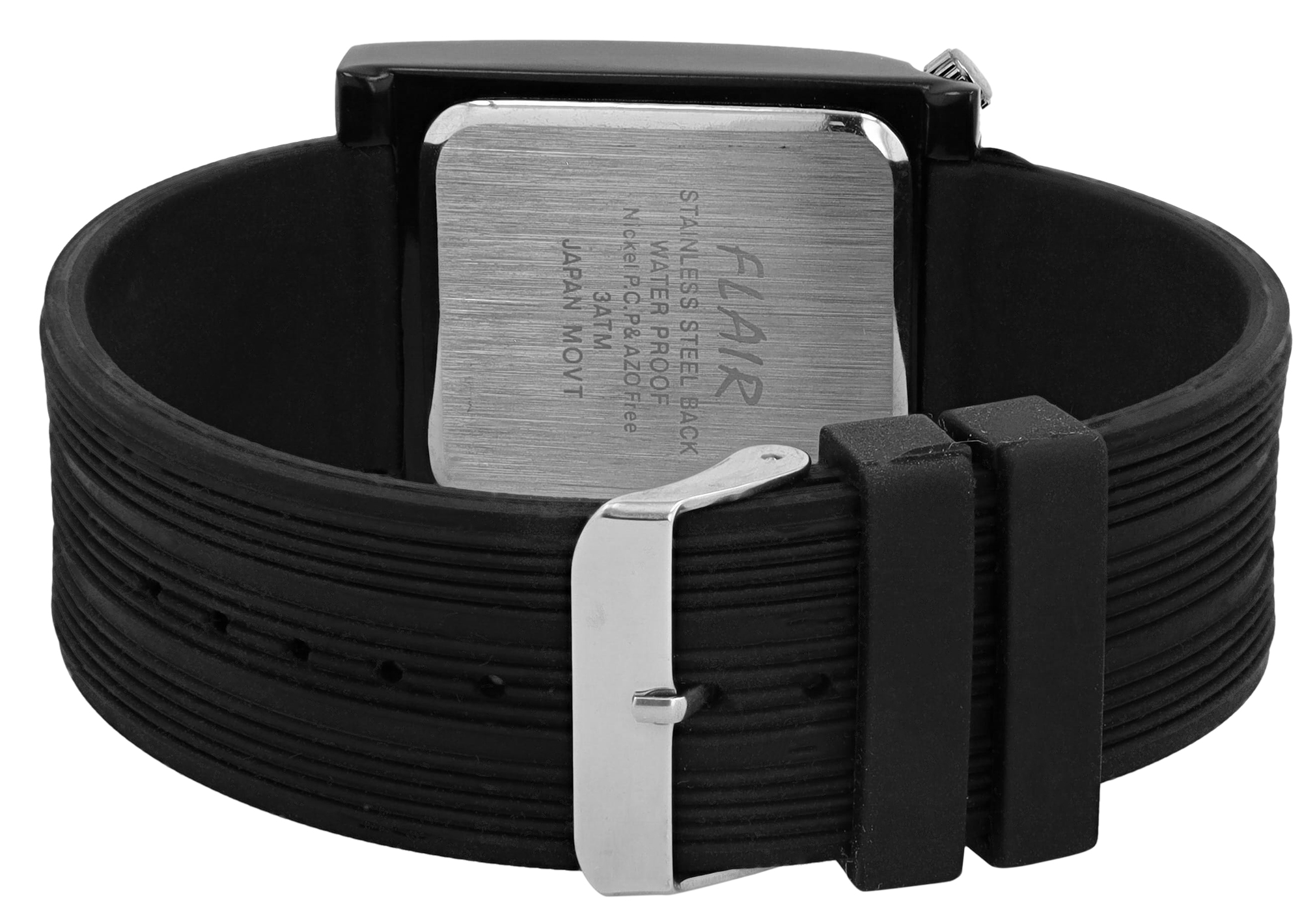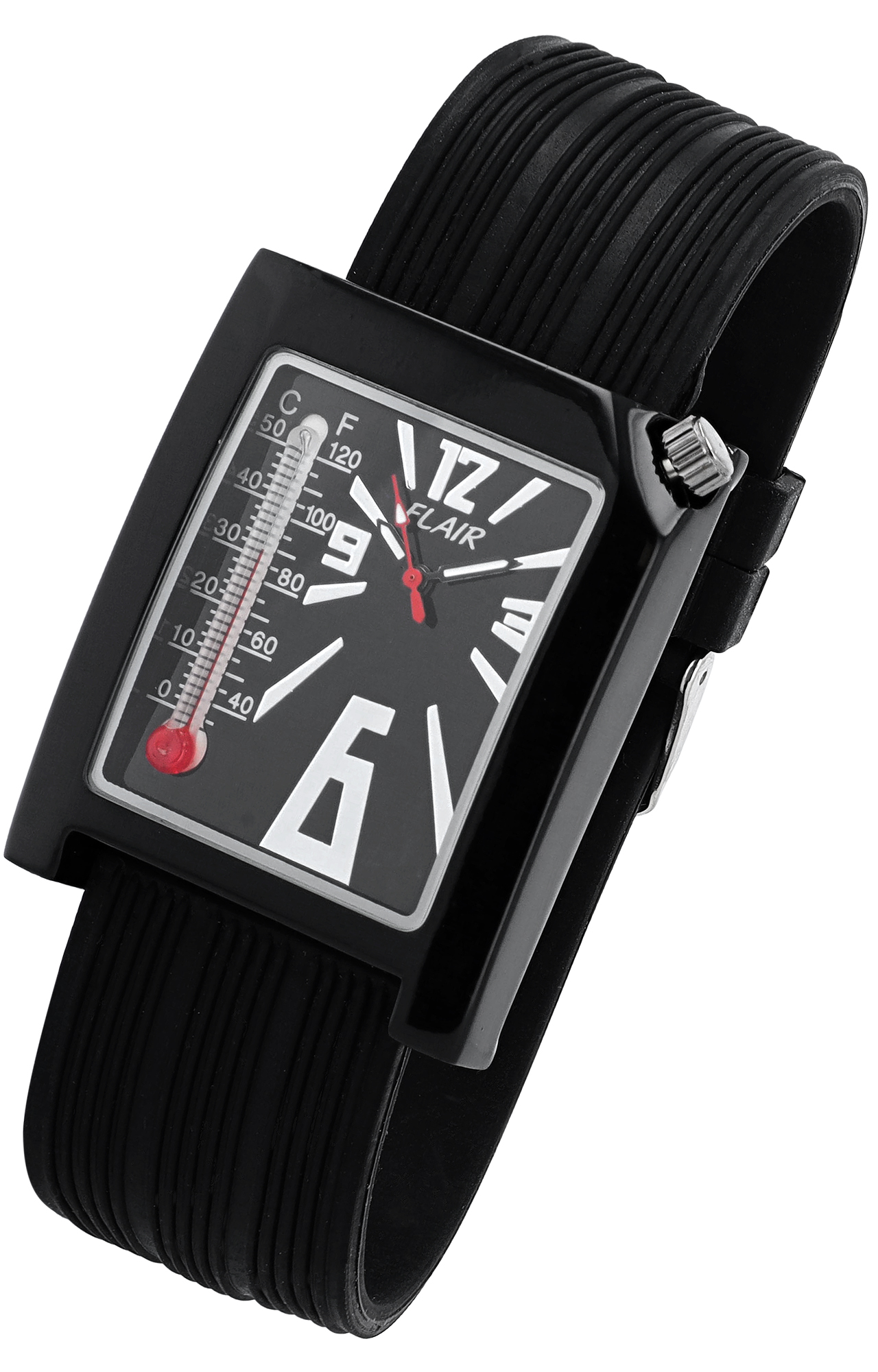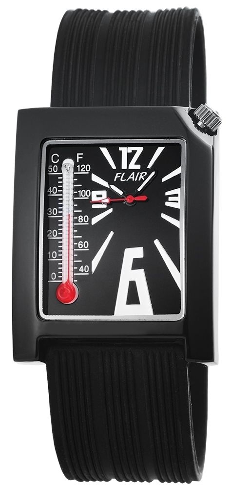 Die Analog Herrenuhr der Marke Flair verfügt über ein Hochwertiges Quarzwerk. Das Silikonarmband ist 24 mm breit und wird mit einer Dornschließe geöffnet. Die Gesamtlänge beträgt 24 cm. Das Metallgehäuse mit Mineralglas hat eine Abmessung von 45x36 mm und 11 mm Gehäusehöhe. Der Gehäusedeckel ist aus Edelstahl gefertigt. Die Uhr ist 3 ATM druckgeprüft. Highlight der Uhr, das eingebaute Thermometer im Ziffernblatt.