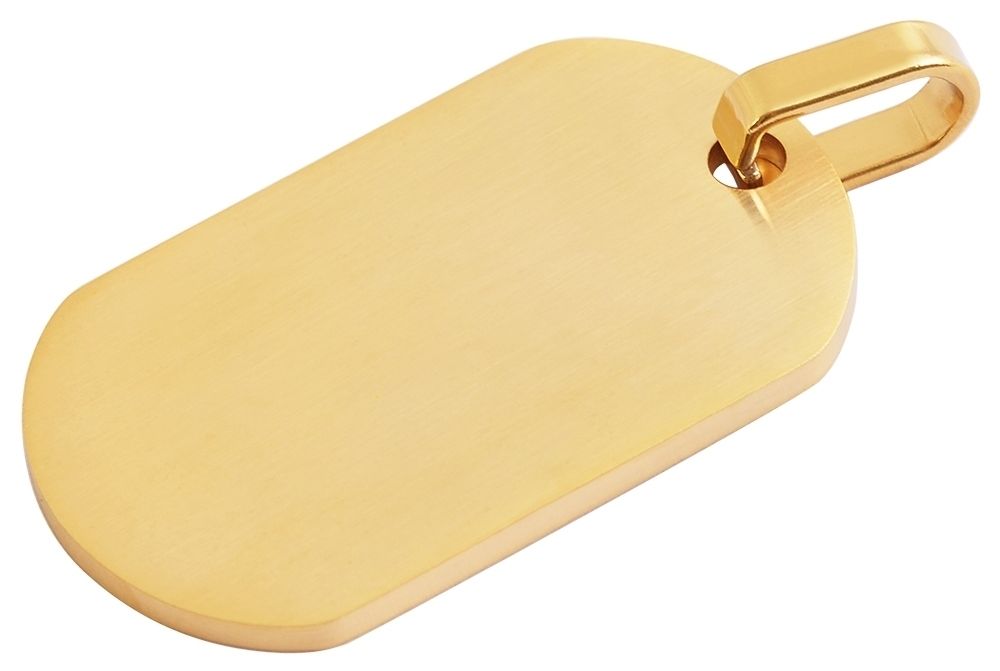 Der goldfarbene Gravuranhänger der Marke Akzent wurde aus Edelstahl gefertigt und hat eine mattierte Oberfläche. Die Außenkanten des Anhängers sind abgerundet, er hat eine Länge von 38 mm, eine Breite von 22 mm und eine Materialstärke von 2 mm. Der Edelstahlanhänger bietet genug Fläche um mit Gravuren aller Art versehen zu werden, sodass er sich perfekt als personalisiertes Geschenk für besondere Erinnerungen und einen besonderen Menschen eignet. Dank einer ovalen Öse lässt sich der Anhänger beliebig an verschiedenen Ketten anbringen. Durch das robuste Material und die hochwertige Verarbeitung verspricht der Schmuckanhänger eine lange Lebensdauer.