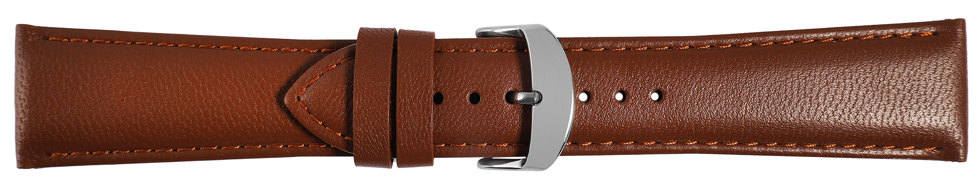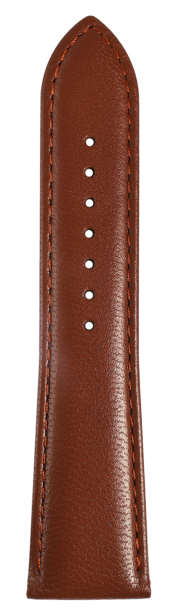 Das gepolsterte Armband ist mit einer feinen braunen Naht abgesetzt und verleiht der Uhr einen besonders stilvollen Look. Der Schließenanstoß ist 2 mm schmaler als die Anstoßbreite, da das Band schmal zuläuft. Die Gesamtlänge des Armbandes variiert je nach Anstoßbreite und liegt zwischen 18 cm und 19,5 cm.