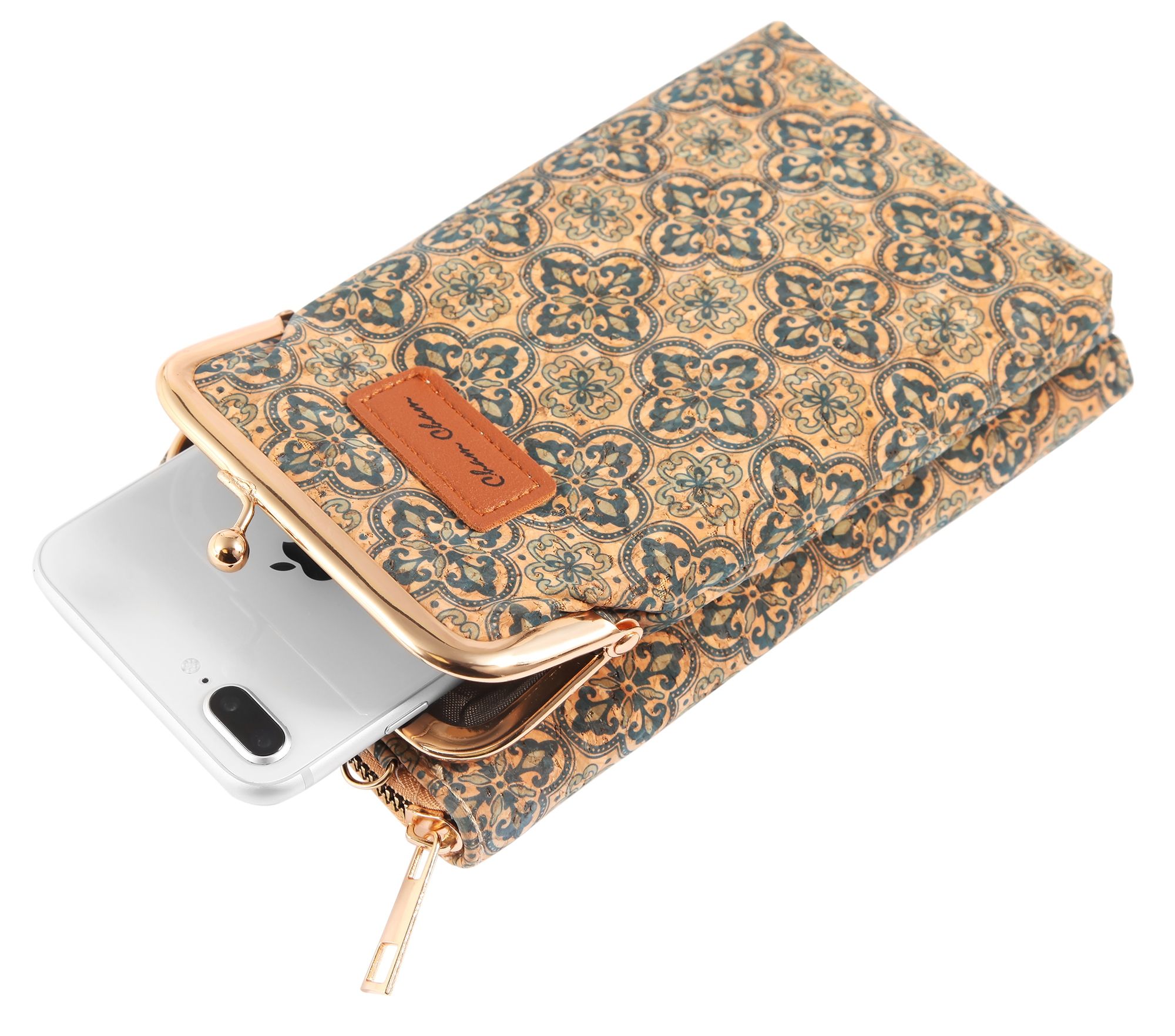 Die Handyumhängetasche mit Geldbörse ist aus Kork gefertigt und ist in verschiedenen modischen Farben und Mustern erhältlich. Sie ist für viele Freizeitaktivitäten bestens geeignet und kann das mühselige Tragen einer großen Handtasche ersetzen. Die Crossbody Bag überzeugt nicht nur durch ihr minimalistisches Design, sondern auch durch die praktische Aufbewahrungsmöglichkeit aller wichtigen Gegenstände. Sie verfügt über eine Geldbörse, die mit einem Reißverschluss geöffnet und verschlossen wird. Dort enthalten sind 6 Kreditkartenfächer, 2 Geldscheinfächer und 1 Reißverschlussfach für das Kleingeld. Die Handytasche lässt sich separat mit Hilfe eines klassischen Bügelverschlusses mühelos öffnen und schließen. Die Größe der Handyumhängetasche ergibt sich aus einer Länge von 19 cm, einer Breite von 11,5 cm und einer Stärke von 4,5 cm im ungefüllten Zustand. Sie bietet genug Stauraum um alles Wichtige übersichtlich zu verstauen und ist auch für große Handys, wie zum Beispiel das iPhone 15, iPhone 15 Pro und iPhone 15 Pro Max geeignet. Der Umhängegurt besteht aus Metall und hat eine Länge von 130 cm. Zudem ist er abnehmbar, sodass sich die Smartphonetasche auch als Clutch tragen lässt. Diese Tasche sieht nicht nur cool aus, sie ist auch ein super praktischer Begleiter in vielen Alltagssituationen.