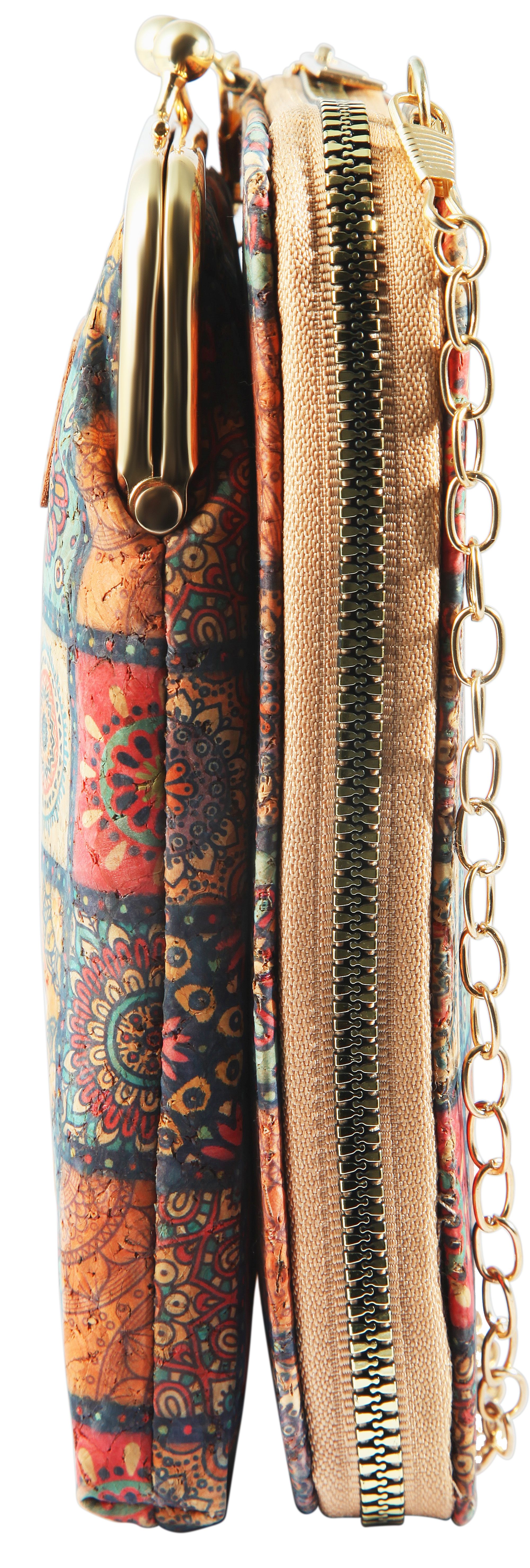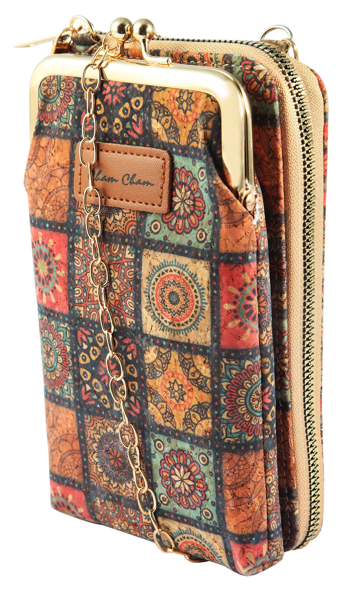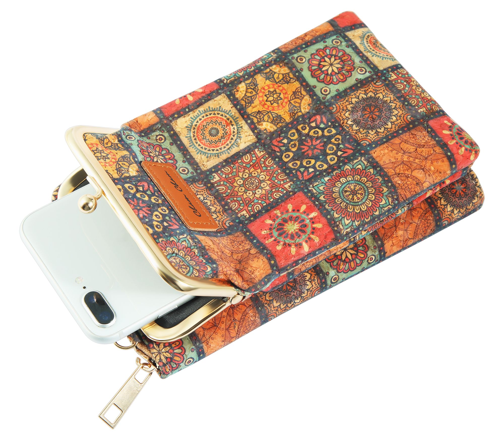 Die Handyumhängetasche mit Geldbörse ist aus Kork gefertigt und ist in verschiedenen modischen Farben und Mustern erhältlich. Sie ist für viele Freizeitaktivitäten bestens geeignet und kann das mühselige Tragen einer großen Handtasche ersetzen. Die Crossbody Bag überzeugt nicht nur durch ihr minimalistisches Design, sondern auch durch die praktische Aufbewahrungsmöglichkeit aller wichtigen Gegenstände. Sie verfügt über eine Geldbörse, die mit einem Reißverschluss geöffnet und verschlossen wird. Dort enthalten sind 6 Kreditkartenfächer, 2 Geldscheinfächer und 1 Reißverschlussfach für das Kleingeld. Die Handytasche lässt sich separat mit Hilfe eines klassischen Bügelverschlusses mühelos öffnen und schließen. Die Größe der Handyumhängetasche ergibt sich aus einer Länge von 19 cm, einer Breite von 11,5 cm und einer Stärke von 4,5 cm im ungefüllten Zustand. Sie bietet genug Stauraum um alles Wichtige übersichtlich zu verstauen und ist auch für große Handys, wie zum Beispiel das iPhone 15, iPhone 15 Pro und iPhone 15 Pro Max geeignet. Der Umhängegurt besteht aus Metall und hat eine Länge von 130 cm. Zudem ist er abnehmbar, sodass sich die Smartphonetasche auch als Clutch tragen lässt. Diese Tasche sieht nicht nur cool aus, sie ist auch ein super praktischer Begleiter in vielen Alltagssituationen.