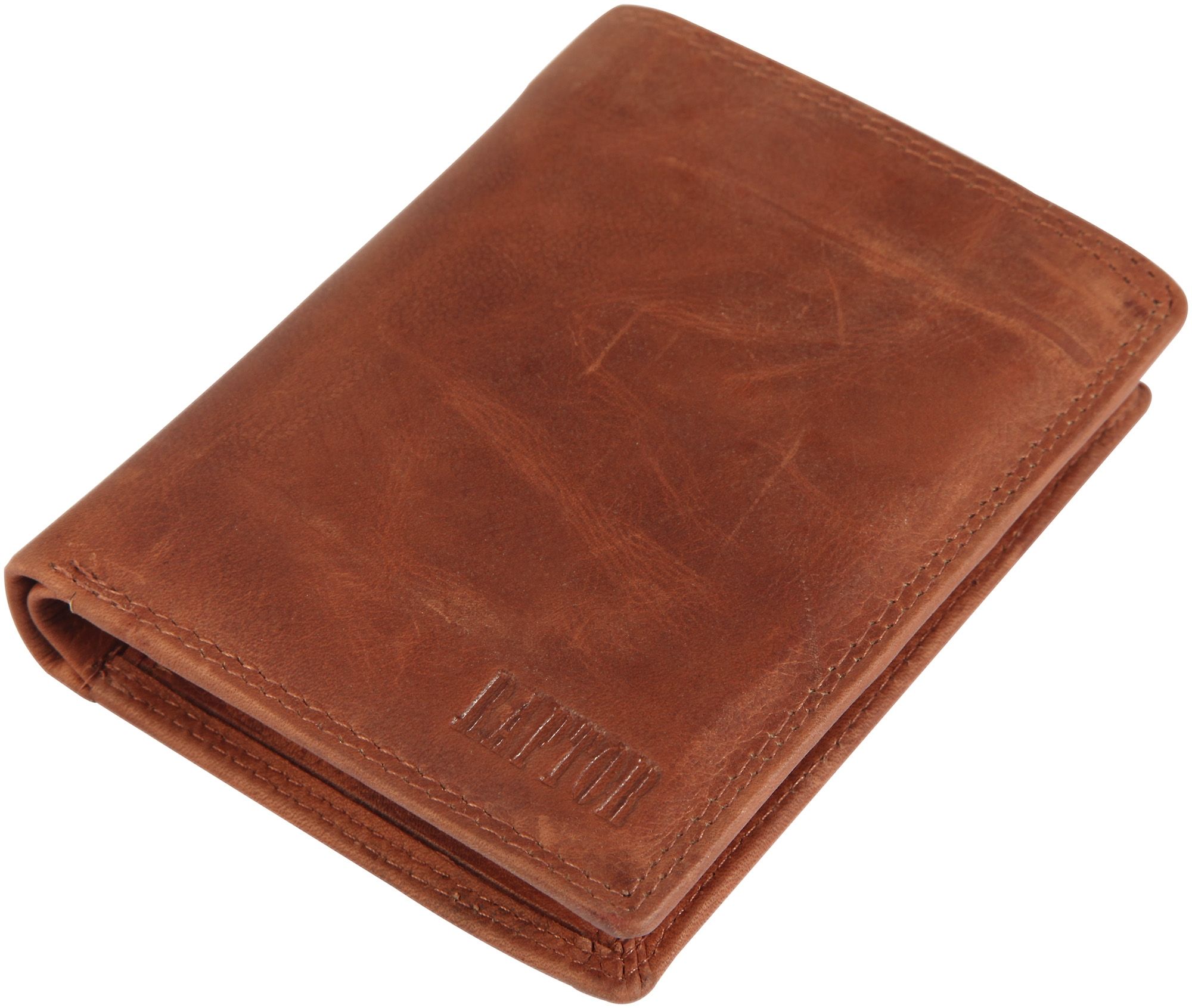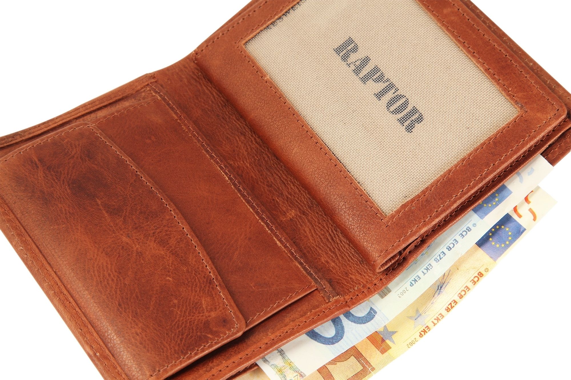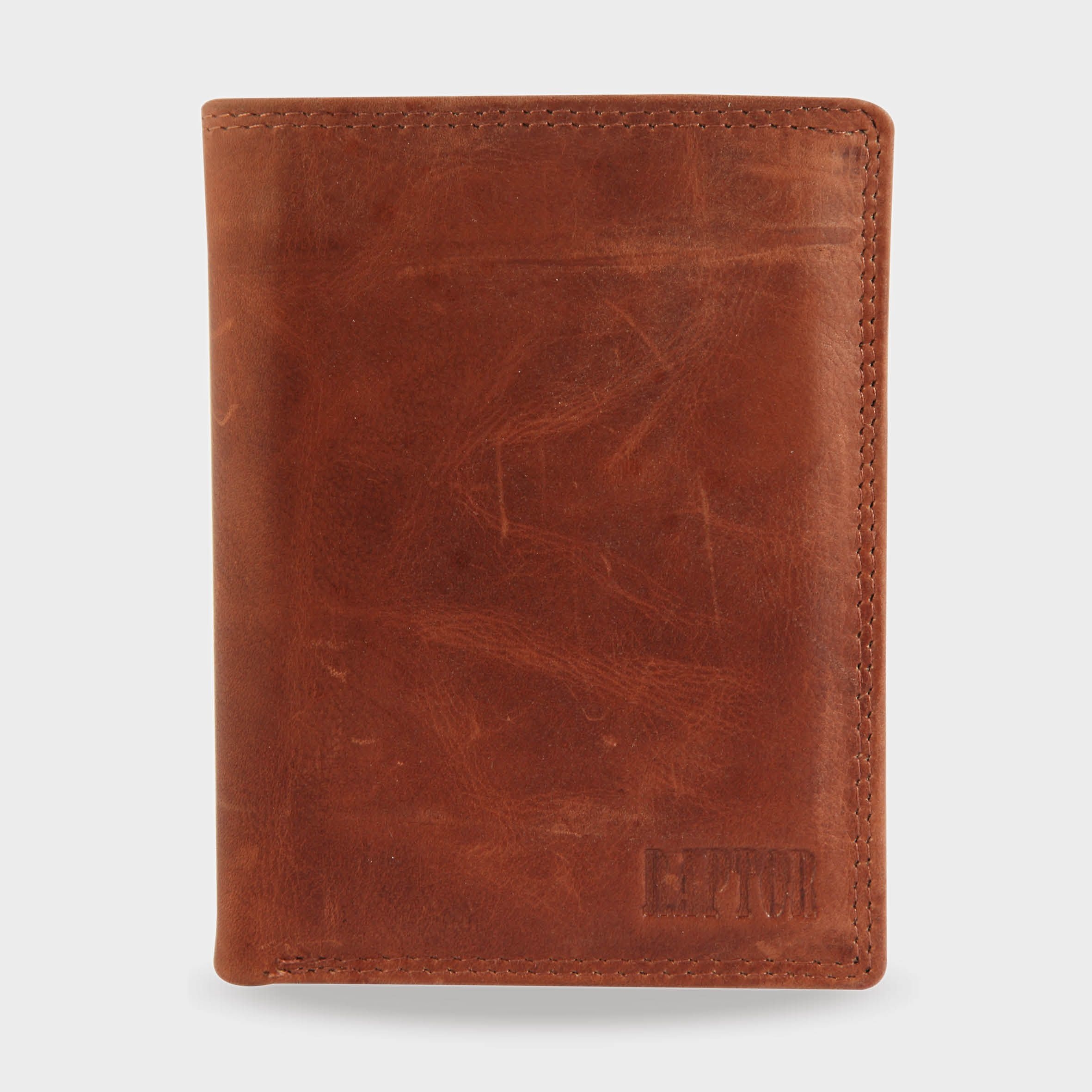 Raptor Herren Geldbörse aus Echtleder. Die Hochformat-Geldbörse ist 10 cm breit und 13 cm hoch. Die Farbe ist Braun. Sie verfügt über 2 Geldscheinfächer, ein Kleingeldfach, 7 Kreditkartenfächer, und ein transparentes Ausweisfach.