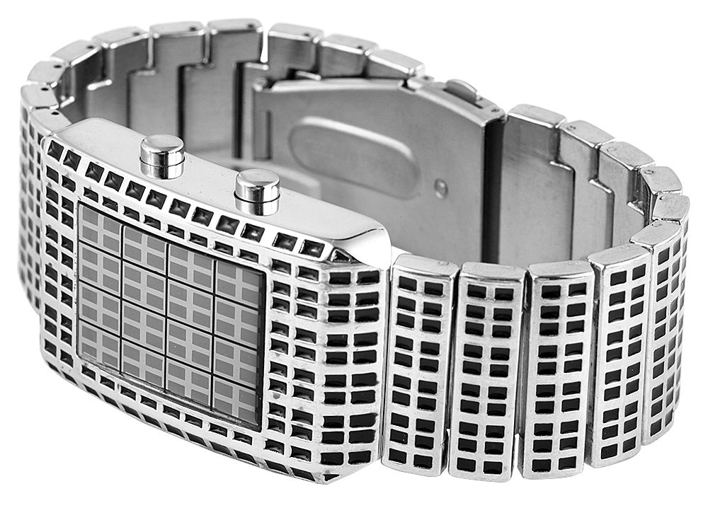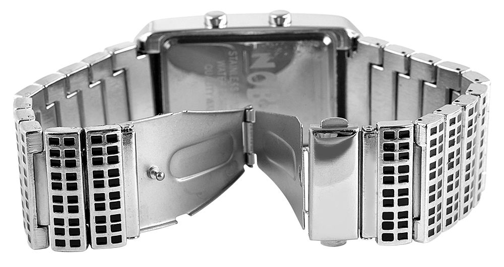 Die Digital Herrenuhr verfügt über ein Hochwertiges Quarzwerk. Das Edelstahlarmband ist 26 mm breit und wird mit einer Edelstahlfaltschließe geöffnet. Die Gesamtlänge beträgt 19 cm. Das Metallgehäuse mit Mineralglas hat eine Abmessung von 30x52 mm und 13 mm Gehäusehöhe. Der Gehäusedeckel ist aus Edelstahl gefertigt. Die Herrenuhr hat folgende Eigenschaften: Datumsanzeige.