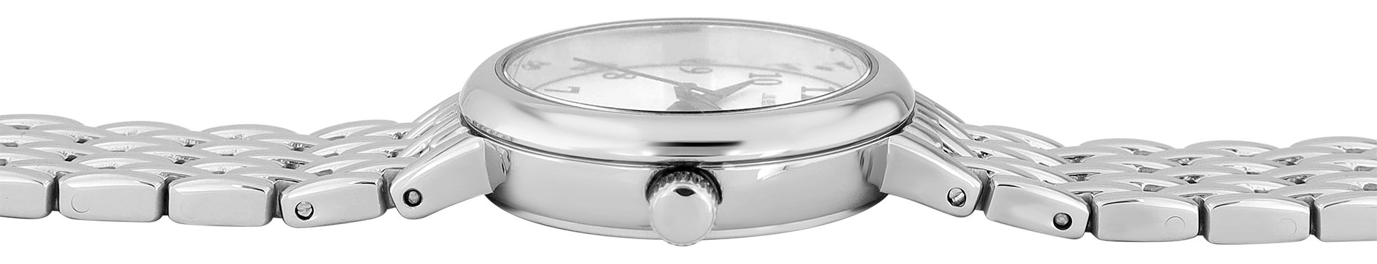Diese zierliche Damenuhr besticht durch das runde, schlichte Design des polierten Gehäuses mit einem Durchmesser und einer Höhe von 28 x 8 mm sowie das zarte Gliederarmband aus Edelstahl in Flechtoptik. Im Kontrast dazu zeigen sich die unifarbenen in kräftigen Farben gehaltenen Zifferblätter der formschönen Uhren mit großen arabischen Ziffern in Weiß oder Schwarz.