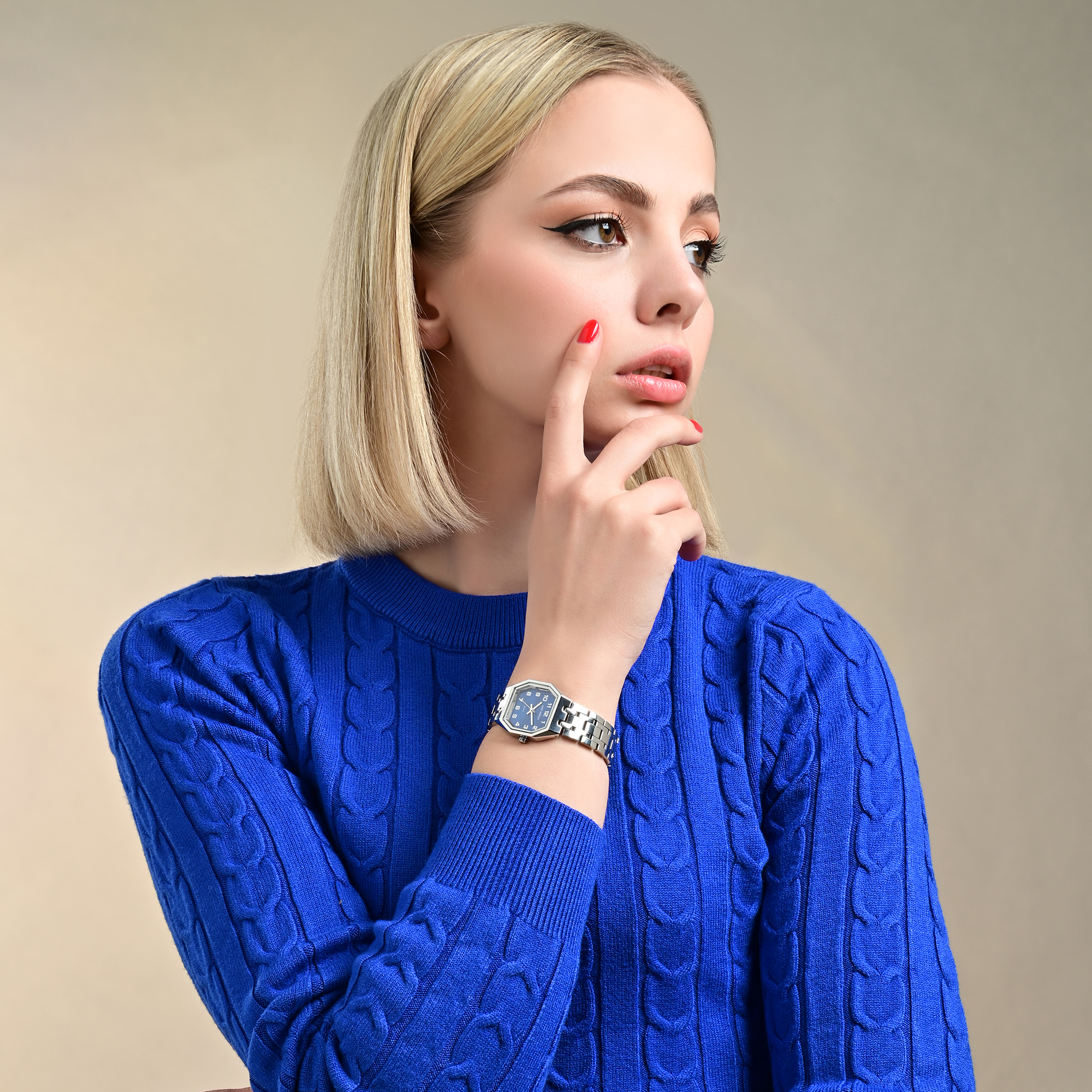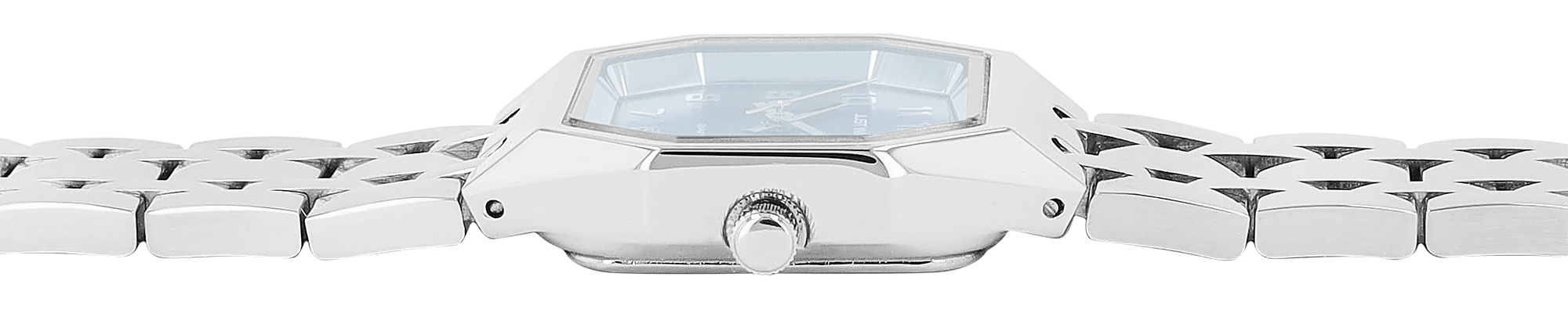 Das achteckige Gehäuse (26 x 25 x 7,5 mm) verleiht dieser Damenuhr eine besondere Note. Das Ziffernblatt ist mit klaren arabischen Ziffern versehen, die eine gute Ablesbarkeit gewährleisten. Die schlichten, Zeiger für Stunde, Minute und Sekunde unterstreichen das elegante Erscheinungsbild.