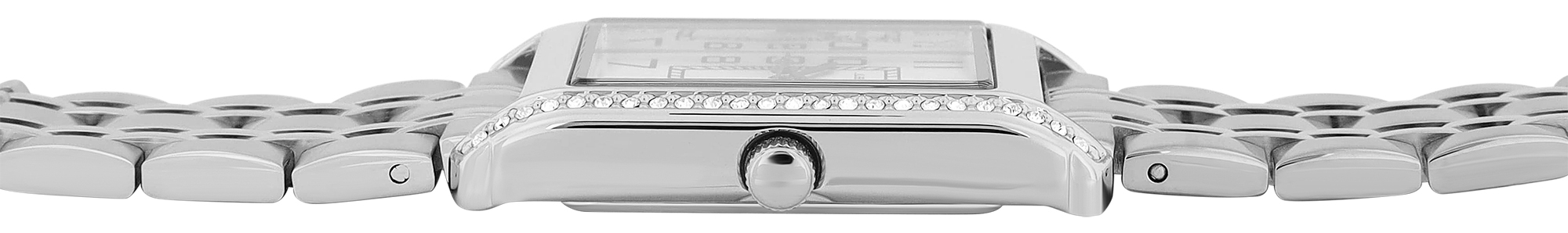 Eine klassische Damenuhr mit modernen Elementen, Similisteine entlang der Längsseiten des klassisch rechteckigen Gehäuses mit einer Länge und Breite von 30 x 24 mm, bei einer Höhe von 8 mm: ein ungewöhnliches Zifferblatt, bestückt mit großen arabischen Ziffern und einem Strichindex um das Zentrum des Zifferblattes, der nicht nur zweckmäßig sondern zugleich auch stilvoll ist und der Uhr modernen Chique verleiht. Gehäuseboden und auch das klassische Gliederarmband der Uhr im verjüngenden Stil, am Steg 18 mm breit, mit polierten und matten Gliedelementen im alternierenden Turnus sind aus hochwertigem Edelstahl gefertigt, der für seine hypoallergenen und korrosionsbeständigen Eigenschaften bekannt ist.