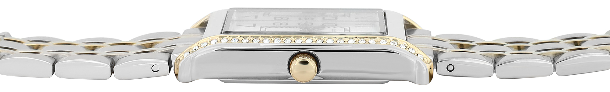 Eine klassische Damenuhr mit modernen Elementen, Similisteine entlang der Längsseiten des klassisch rechteckigen Gehäuses mit einer Länge und Breite von 30 x 24 mm, bei einer Höhe von 8 mm: ein ungewöhnliches Zifferblatt, bestückt mit großen arabischen Ziffern und einem Strichindex um das Zentrum des Zifferblattes, der nicht nur zweckmäßig sondern zugleich auch stilvoll ist und der Uhr modernen Chique verleiht. Gehäuseboden und auch das klassische Gliederarmband der Uhr im verjüngenden Stil, am Steg 18 mm breit, mit polierten und matten Gliedelementen im alternierenden Turnus sind aus hochwertigem Edelstahl gefertigt, der für seine hypoallergenen und korrosionsbeständigen Eigenschaften bekannt ist.