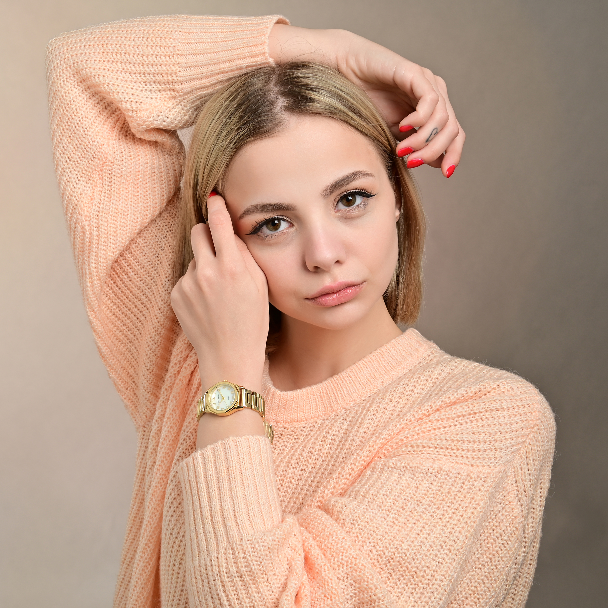 Diese ansprechende Damenuhr verfügt über ein robustes Edelstahl-Gliederarmband, das einen komfortablen Sitz am Handgelenk gewährleistet. Die Gesamtlänge der Uhr beträgt 22 cm, die Bandbreite misst am Steg 14 mm.