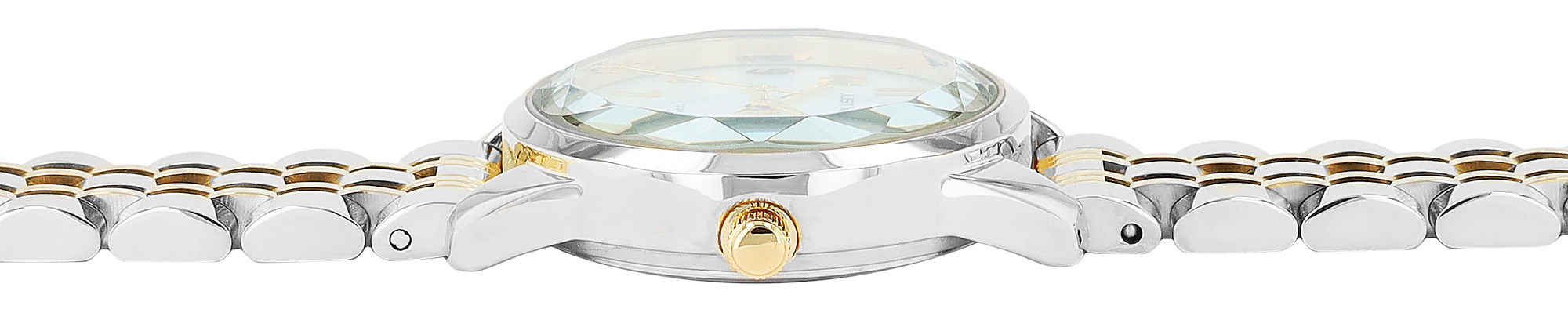 Das runde Gehäuse mit einem Durchmesser von 30 mm fasst ein gehärtetes Mineralglas. Ein besonderes Detail ist der facettierte Schliff des Mineralglases, der das Licht auf einzigartige Weise bricht und der Uhr eine edle und funkelnde Optik verleiht.