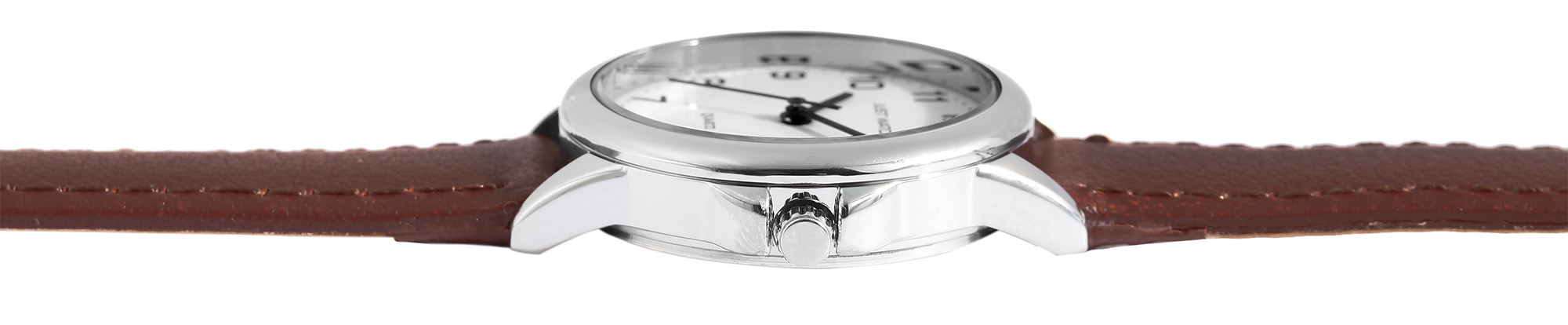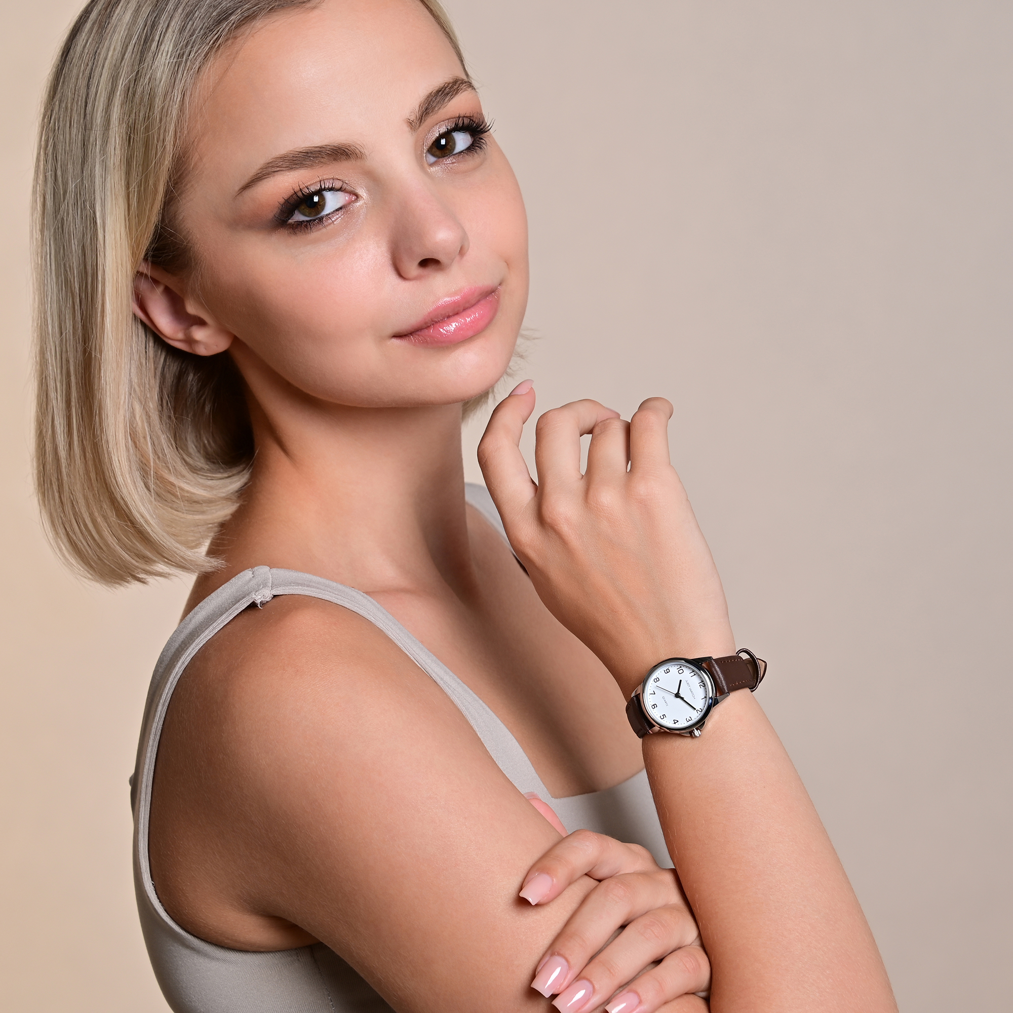 Das Gehäuse mit einem Durchmesser von 29 mm und einer Höhe von 8,5 mm verleiht der Uhr eine dezente Optik. Das Zifferblatt mit arabischen Ziffern und drei Zeigern sorgt für eine klare Struktur.