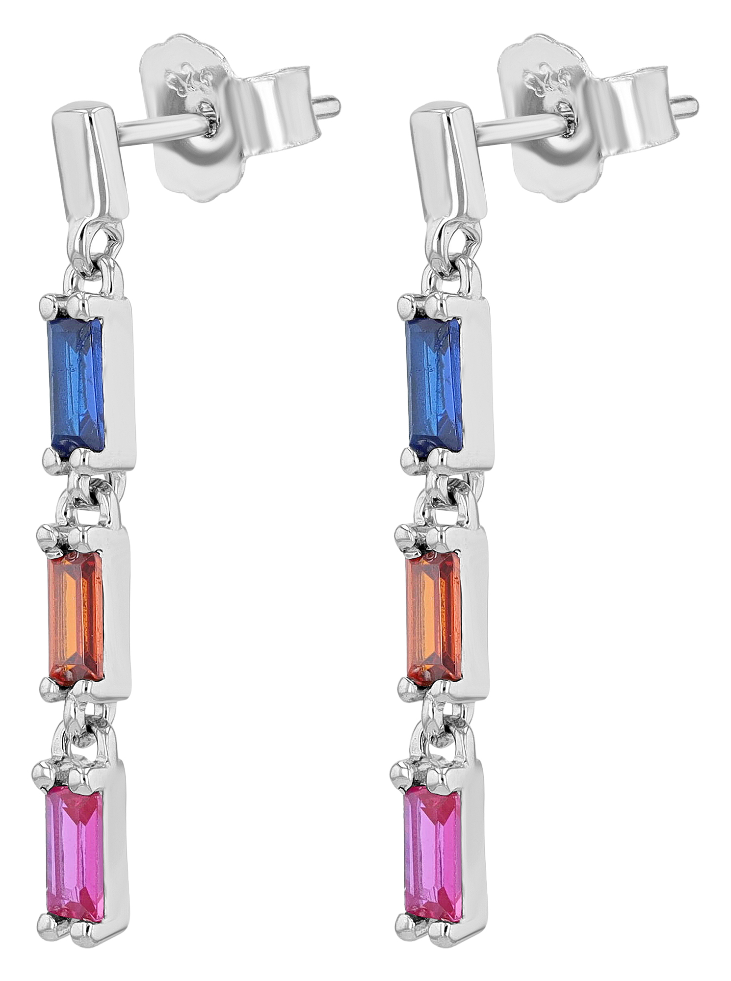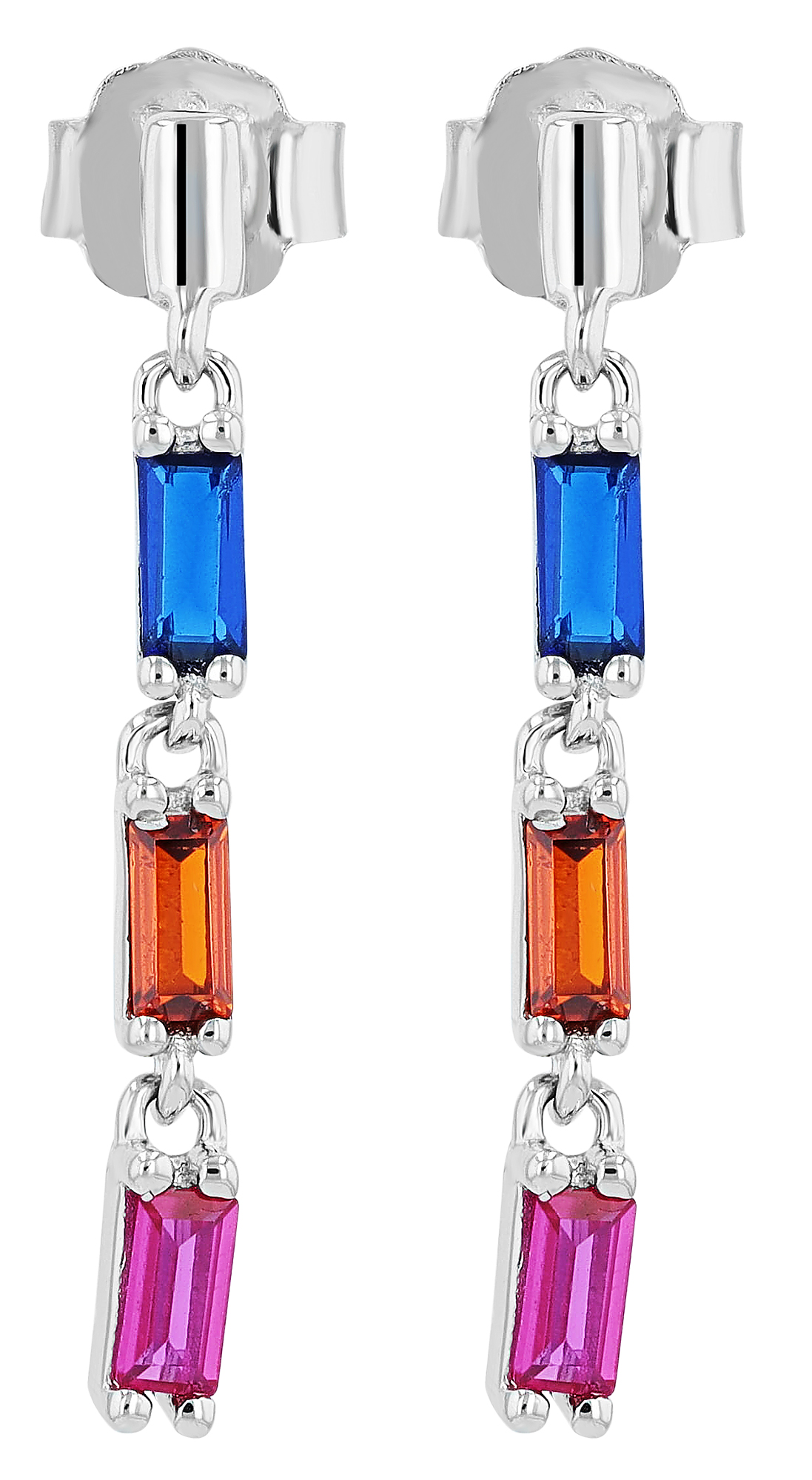 Diese edlen Ohrhänger aus 925er Sterling Silber sind rhodiniert und verleihen damit den Ohrhängern einen glänzenden, langen Schutz vor Anlaufen, die 3 farbigen, untereinander angebrachten Zirkonia-Steine in Stäbchenform setzten einen faszinierenden Akzent und sorgen für einen lebendigen Farbverlauf. Mit den Maßen 25 x 3 mm besitzt dieses außergewöhnliche Schmuckstück ein filigranes Aussehen, das perfekt für den täglichen Gebrauch oder besondere Anlässe geeignet ist. Der Steckverschluss sorgt für einen komfortablen Sitz und einfachen Tragekomfort, ein Accessoire für jeden Anspruch.