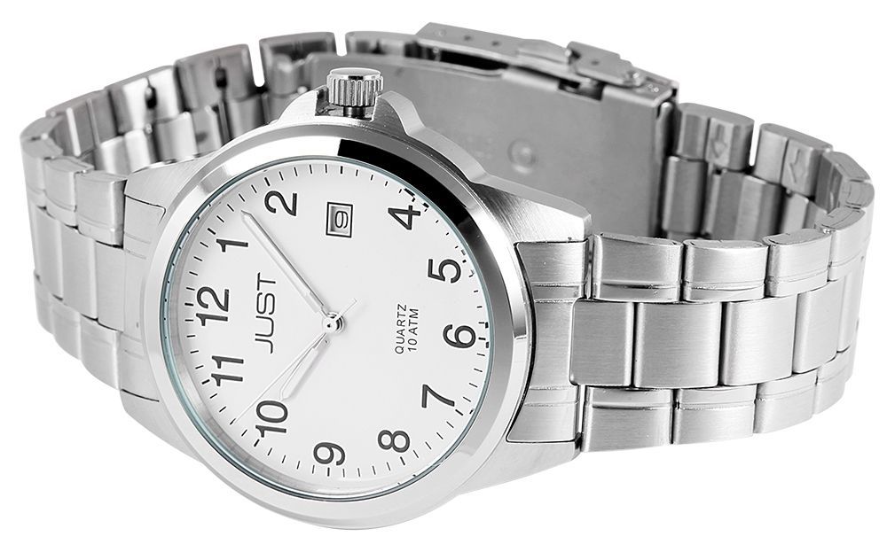 Die analoge 3-Zeiger Herrenarmbanduhr der Marke Just verfügt über das hochwertige Quarzuhrwerk Miyota 2115. Das silberfarbene Edelstahlarmband ist im Anstoß 18 mm breit und lässt sich über eine silberfarbene Edelstahlfaltschließe öffnen und schließen. Die Gesamtlänge der Uhr beträgt 23 cm. Das silberfarbene Edelstahlgehäuse mit Mineralglas hat eine Abmessung von 38 mm im Durchmesser und einer Gehäusehöhe von 11 mm. Der Gehäuseboden ist ebenfalls aus Edelstahl gefertigt. Die Uhr hat eine Datumsanzeige auf drei Uhr. Das Zifferblatt ist weiß und die Zeiger und Ziffern sind schwarz. Durch die mit Superluminova beschichteten Zeiger lässt sich auch im Dunkeln die Zeit gut ablesen. Die Uhr hat eine Wasserdichtigkeit von 10 bar. Als Zubehör zu Ihrem Produkt erhalten Sie eine Garantiekarte und eine Originalbox der Marke Just.