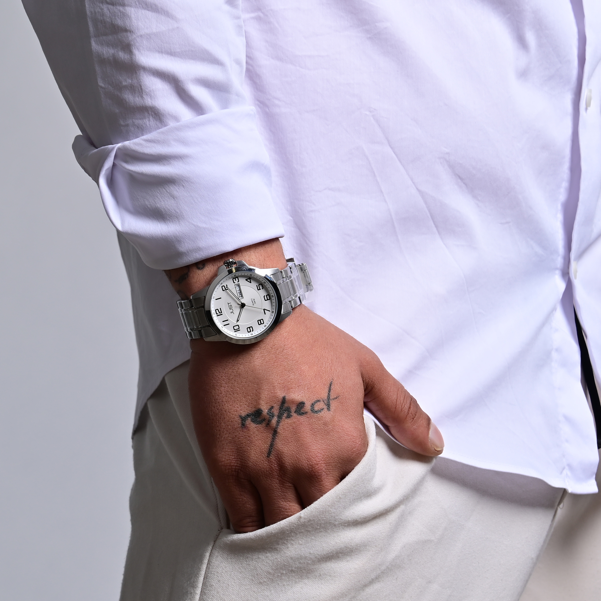 Die analoge 3-Zeiger Herrenarmbanduhr der Marke Just verfügt über ein hochwertiges Quarzuhrwerk. Das Gliederarmband wurde aus Edelstahl gefertigt und hat eine Anstoßbreite von 20 mm. Geöffnet und verschlossen wird es mit einer Edelstahl-Faltschließe inkl. Sicherheitsbügel. Die Gesamtlänge der Uhr beträgt 22,5 cm. Das runde Edelstahlgehäuse mit Mineralglas hat einen Durchmesser von 39 mm und eine Gehäusehöhe von 10,5 mm. Auch der Gehäuseboden wurde aus Edelstahl gefertigt. Zudem verfügt die Uhr über eine Datums- und Wochentagsanzeige und eine Wasserdichtigkeit von 10 bar. Die übersichtliche Einteilung des Zifferblattes ermöglicht ein einfaches und schnelles Ablesen der Uhrzeit. Des Weiteren lässt sich dank der mit Superluminova beschichteten Stunden- und Minutenzeiger die Zeit im Dunkeln ablesen. Als Zubehör zu Ihrem Produkt erhalten Sie eine Garantiekarte und eine Originalverpackung der Marke Just.