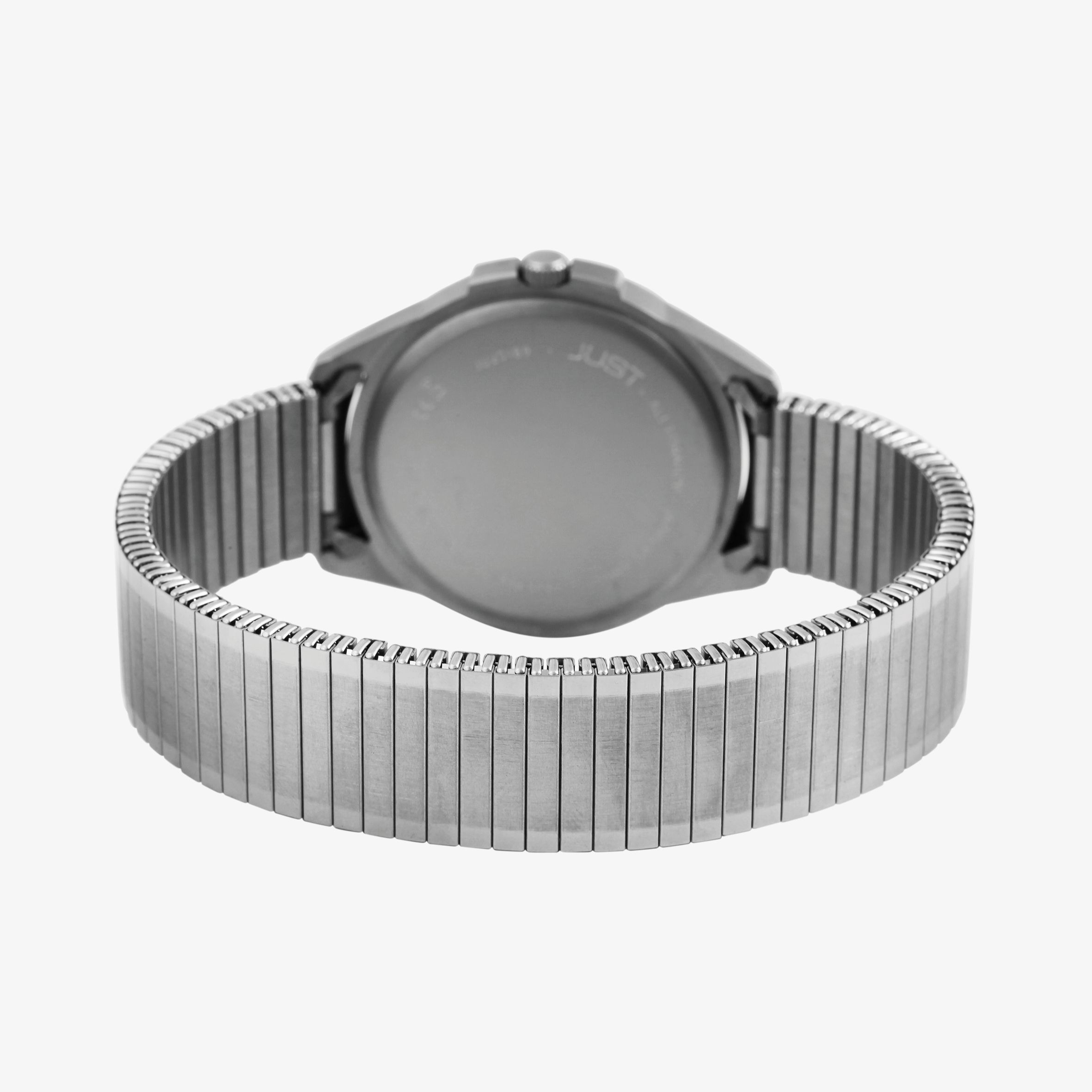 Die analoge 3-Zeiger Herrenarmbanduhr der Marke Just verfügt über ein hochwertiges Quarzuhrwerk. Das praktische Zugarmband wurde aus Titan gefertigt und hat eine Anstoßbreite von 18 mm. Aufgrund des flexiblen Armbandes lässt sich die Uhr besonders bequem und einfach über das Handgelenk ziehen. Die Gesamtlänge der Herrenuhr beträgt 24 cm. Das runde Titangehäuse mit Mineralglas hat einen Durchmesser von 38 mm und eine Gehäusehöhe von 7 mm. Auch der Gehäuseboden wurde aus Titan hergestellt. Zudem verfügt die Uhr über eine Datumsanzeige auf drei Uhr und eine Wasserdichtigkeit von 5 bar. Die übersichtliche Einteilung des Zifferblattes ermöglicht ein einfaches und schnelles Ablesen der Uhrzeit. Als Zubehör zu Ihrem Produkt erhalten Sie eine Garantiekarte und eine Originalverpackung der Marke Just.