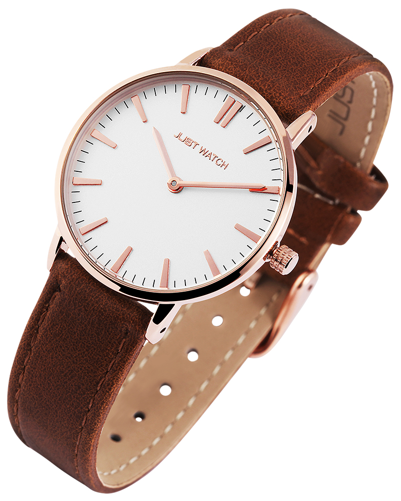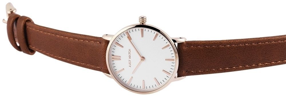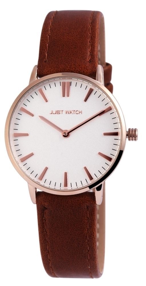 Die analoge 2-Zeiger Damenarmbanduhr der Marke Just Watch verfügt über ein hochwertiges Quarzuhrwerk. Das braune Echtlederarmband hat eine Anstoßbreite von 16 mm und lässt sich mit einer roségoldfarbenen Dornschließe öffnen und schließen. Die Gesamtlänge der Uhr beträgt 23 cm. Das roségoldfarbene Metallgehäuse mit Mineralglas hat eine Abmessung von 33 mm im Durchmesser und einer Gehäusehöhe von 6,5 mm. Der Gehäuseboden ist aus Edelstahl gefertigt. Zusätzlich hat die Uhr eine Wasserdichtigkeit von 3 bar. Das Zifferblatt ist weiß und die Zeiger und Indexe sind ebenfalls roségoldfarben und passen sich optisch gut dem Gesamtbild der Uhr an. Der Zeitmesser überzeugt mit schlichter Eleganz und ist vielseitig kombinierbar.