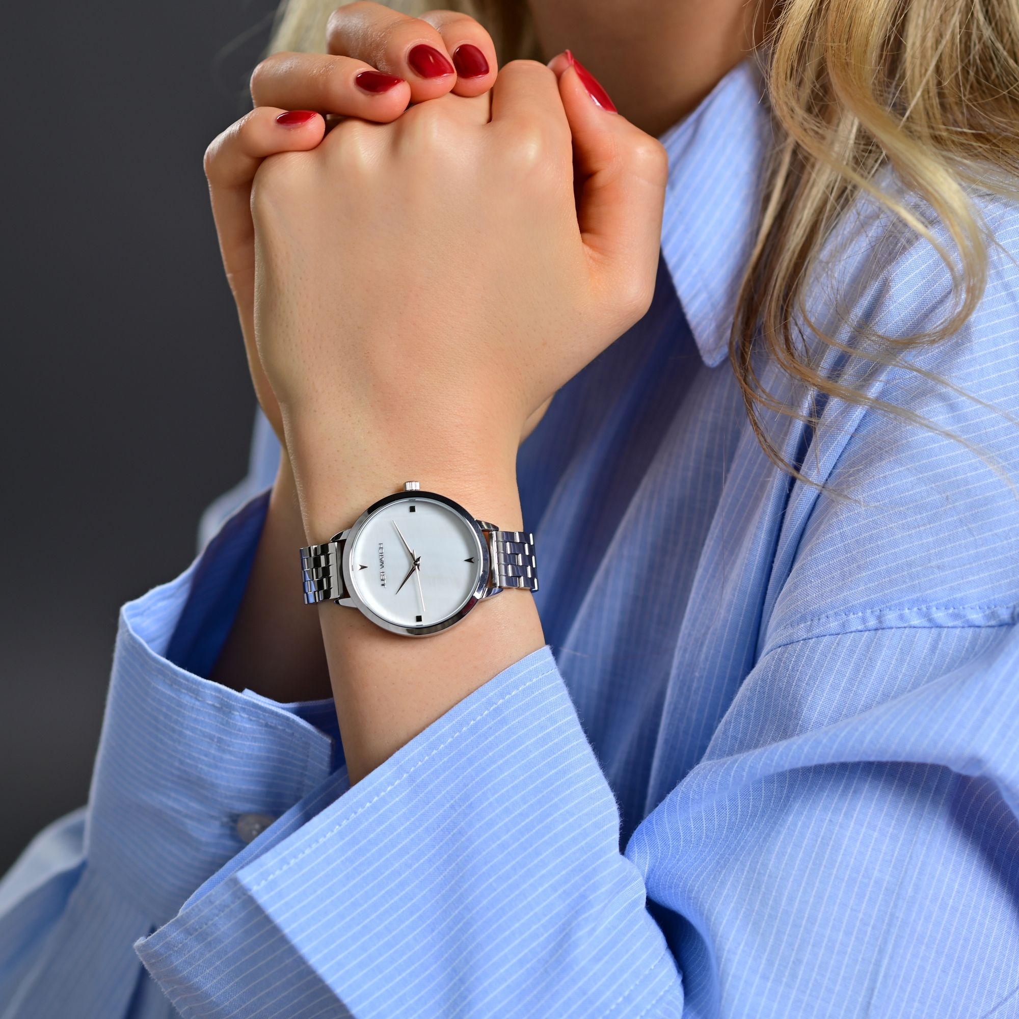 Ausgestattet mit einem hochwertigen Quarzuhrwerk steht unsere Just Watch "Priscilla" für Präzision und Zuverlässigkeit. Die analoge Anzeige mit 3 Zeigern und Punktindex auf zwölf, drei, sechs und neun Uhr verleiht der Uhr ein klares und leicht ablesbares Erscheinungsbild. Das Perlmuttzifferblatt fängt das Licht auf eine bezaubernde Weise ein und verleiht der Damenuhr eine einzigartige Note. Das Gliederband aus Edelstahl mit Faltschließe ist nicht nur ein Statement in Sachen Robustheit, sondern auch ein Ausdruck von raffinierter Eleganz. Mit der Möglichkeit zur individuellen Anpassung durch Entfernen der Elemente bietet das Gliederband eine angenehme Passform. Die Gesamtlänge von 20,5 cm sorgt für einen komfortablen Sitz. Das Gehäuse aus Metall präsentiert sich mit einem Durchmesser von 36 mm und einer Gehäusehöhe von 8,5 mm, was der Uhr eine schlanke und dennoch präsente Silhouette verleiht. Das Mineralglas schützt das einzigartige Perlmuttzifferblatt, während der Gehäuseboden aus Edelstahl die hochwertige Verarbeitung betont. Die Bandbreite von 14 mm rundet das harmonische Design ab. Mit einer Wasserdichtigkeit von 3 Bar ist sie bereit, den Anforderungen des Alltages standzuhalten.