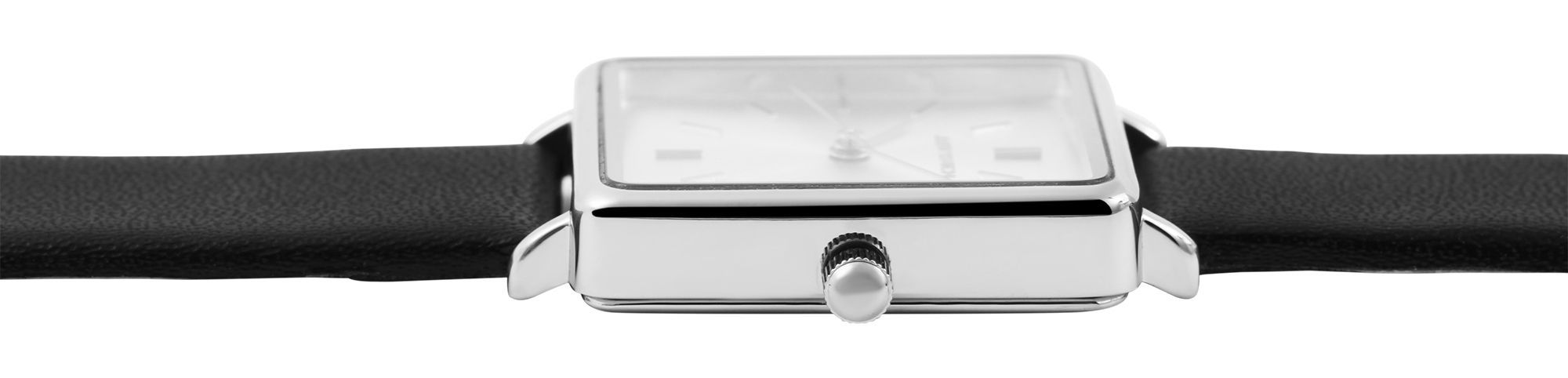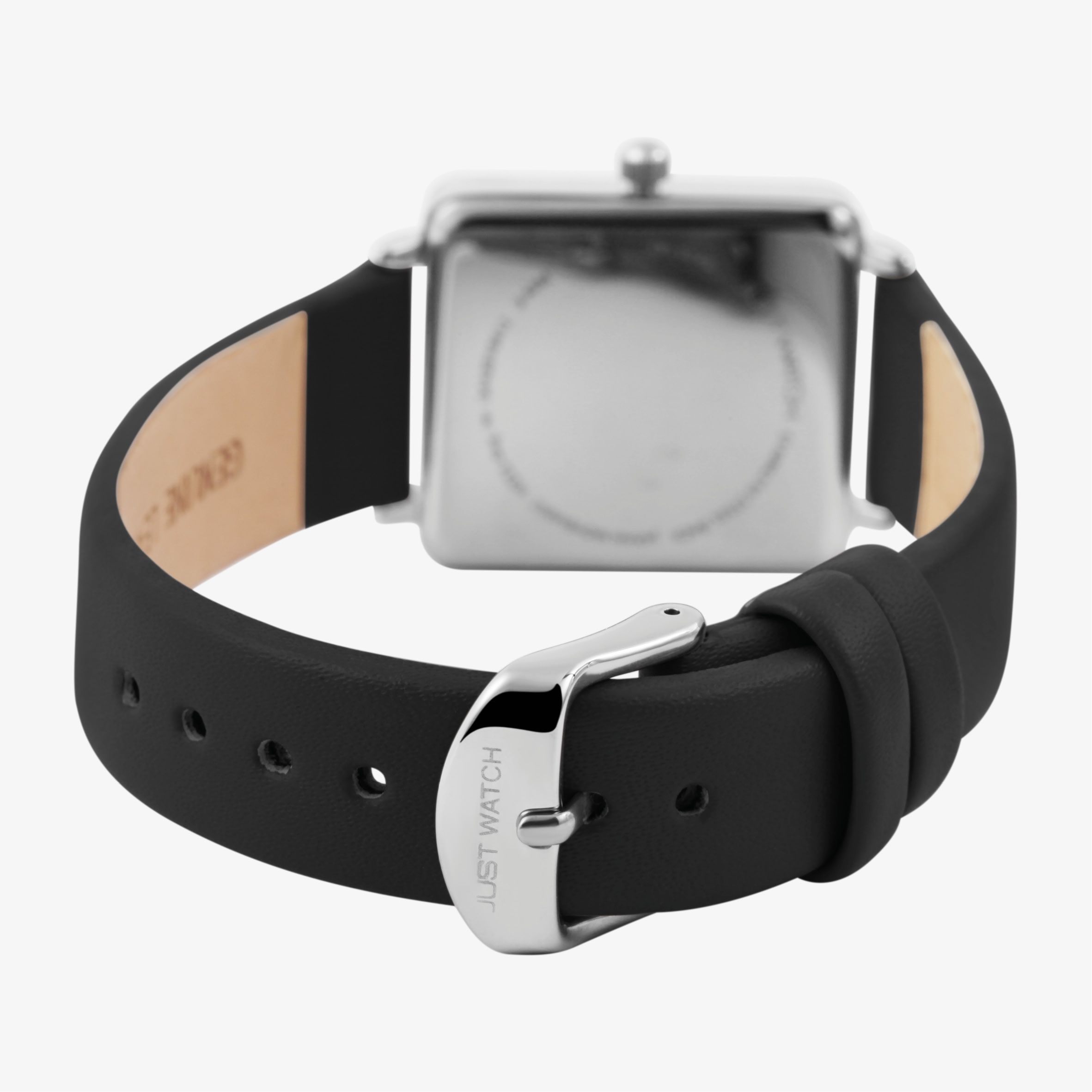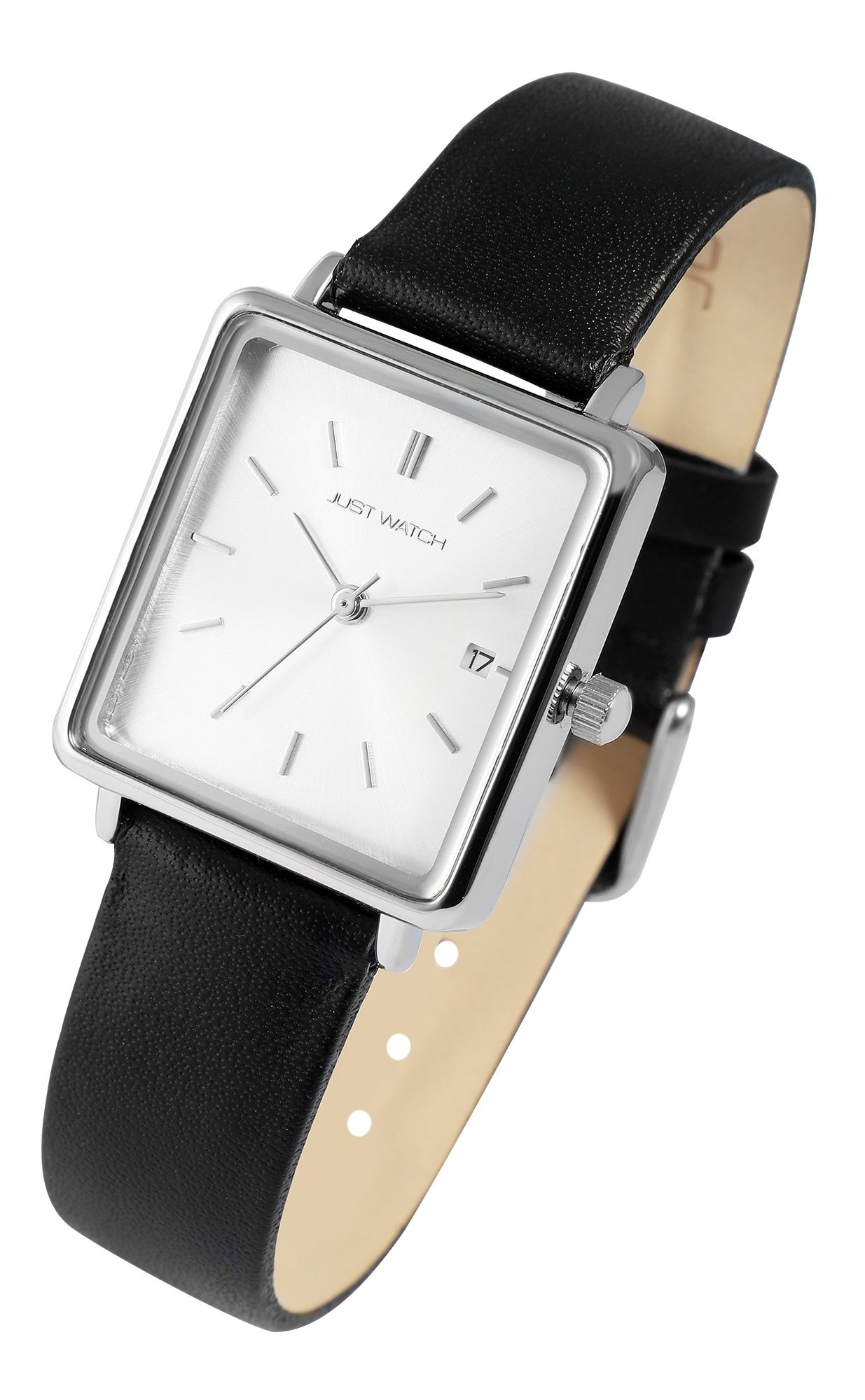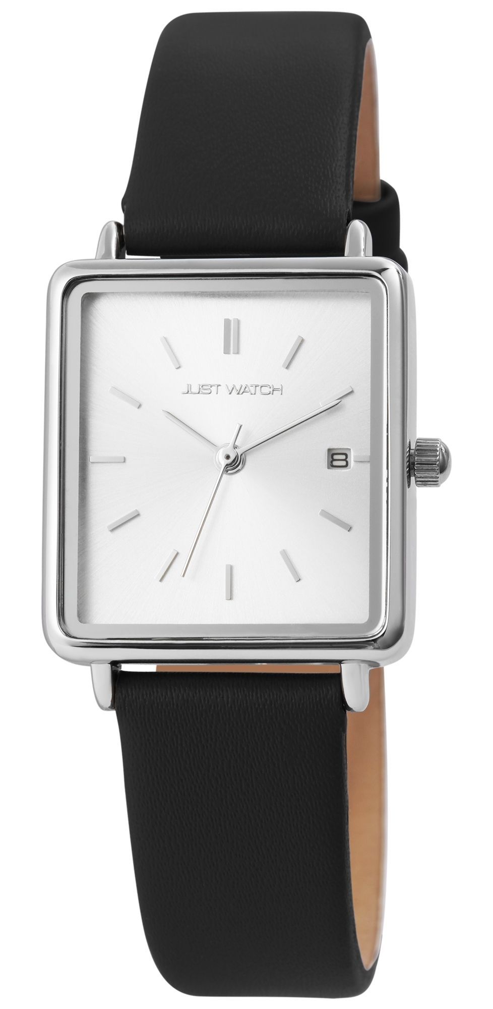 Die analoge 3- Zeiger Damenarmbanduhr der Marke Just Watch verfügt über das hochwertige Quarzuhrwerk Miyota GN10. Das schwarze Echtlederarmband ist am Anstoß 16 mm breit und lässt sich mit einer silberfarbenen Dornschließe öffnen und schließen. Die Gesamtlänge der Uhr beträgt 23 cm. Das silberfarbene Metallgehäuse mit Mineralglas ist rechteckig und hat Abmessungen von 29 mm x 26 mm und eine Gehäusehöhe von 7 mm. Der Gehäuseboden ist aus Edelstahl gefertigt und die Uhr hat eine Wasserdichtigkeit von 3 Bar. Durch die schlichte Einteilung des Zifferblattes lässt sich die Uhrzeit schnell auf einen Blick ablesen. Zudem verfügt die Armbanduhr über eine Datumsanzeige auf drei Uhr. Als Zubehör zu Ihrem Produkt erhalten Sie eine Garantiekarte und eine Originalbox der Marke Just Watch.