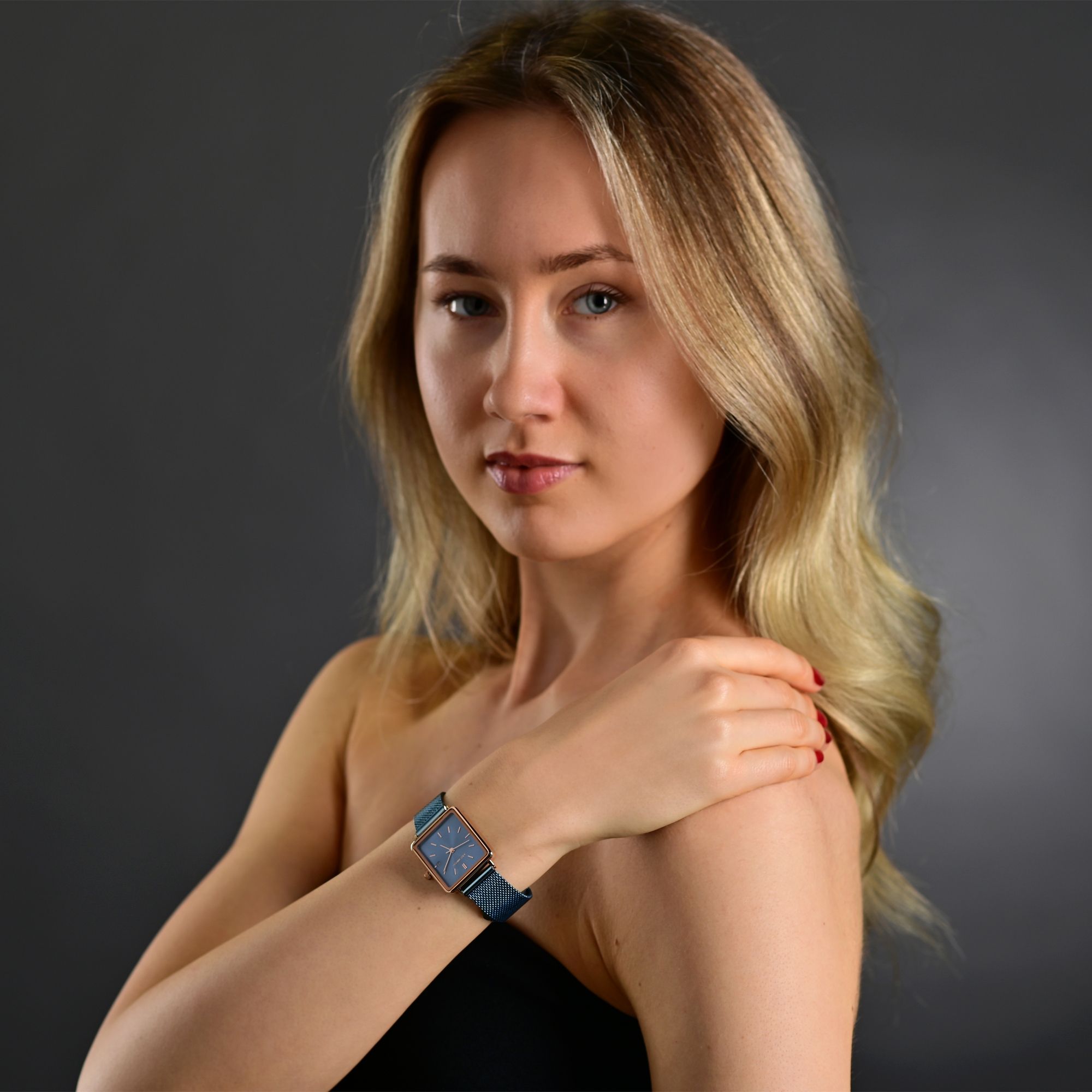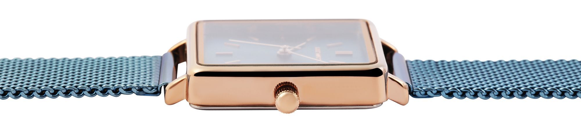 Das schlanke Gehäuse im Format 29 x 26 x 7 mm verleiht der "Sienna" eine elegante und unaufdringliche Optik. Ein besonderes Highlight ist das edle Milanaiseband aus Edelstahl mit einer Bandbreite von 16 mm. Dieses ist komfortabel zu tragen und dank des praktischen Hakenverschlusses auch individuell an das Handgelenk anpassbar. Die Gesamtlänge der Uhr beträgt 22 cm.